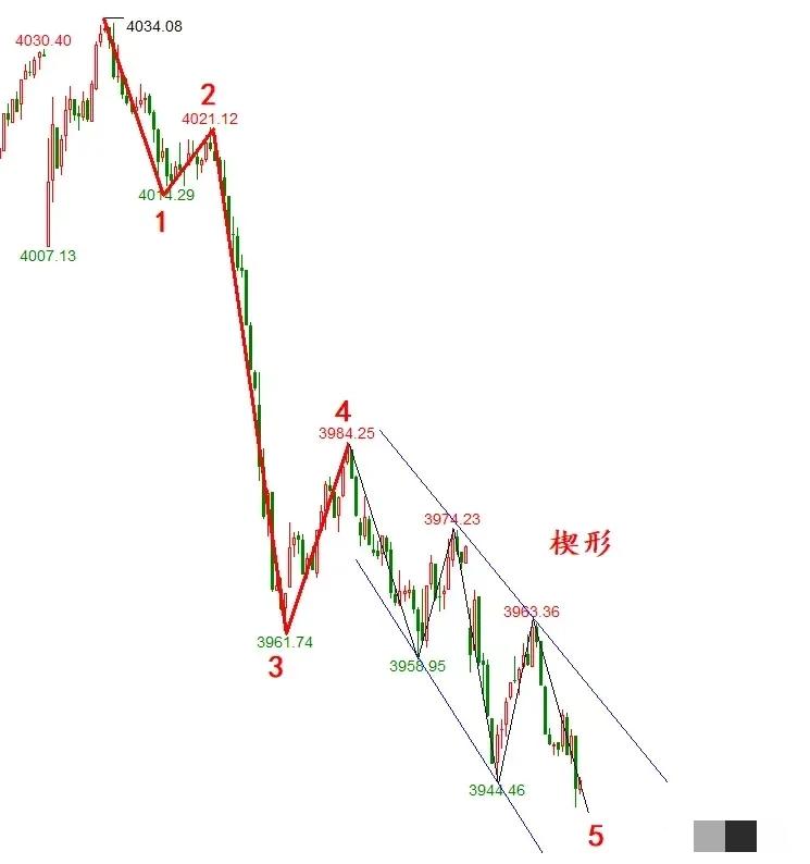 别慌着割肉!4034点开启的第一段下跌已经进入收尾,反击信号早就藏在盘口里了! 懂点浪形分析的都清楚,5分钟图上这标准的5波推动结构,子浪5还带了延长浪,关键是用楔形调整收尾——楔形出现在5浪末端,本身就是下跌动能耗竭的明确信号。还记得昨天中午说3961点的抵抗是子浪4,后续必再跌,现在子浪5也快走完了,逻辑完全对上。 下午13:15-13:30大概率会探明3938-3928点的小低点,盘口反击一触即发。但别盲目跟风,重点看俩:一是反击有没有量能支撑,力度直接定短线低点是否落地;二是谁来当领涨主力,是防御板块护盘还是赛道股带头。 这波下跌收尾后的反击,可不是小打小闹,你觉得这次会是哪个板块扛起领涨大旗?评论区聊聊你的判断~