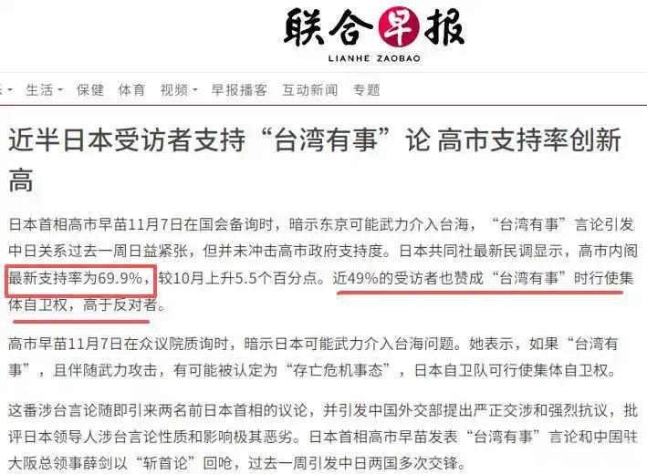 官媒报道中高市早苗是怎么的不得人心,但日本民调显示她的支持率大涨至69.9%,而且有48.8%的人支持她的涉台言论,反对的只有44.2%。另有60.4%的受访者赞成她提出的增加防卫费的方针,这都说明在日本持高市早苗同样立场,或是说支持高市早苗言论的大有人在,而且占比几乎达到了一半。 这是在高市早苗涉台言论发酵一周后的民调数据,具有实时性和可参考性,这才是日本国内的现状。一味只报喜不报忧又有什么意思呢?别人又看不见你这报道,到头来还不是只是在忽悠自己人?