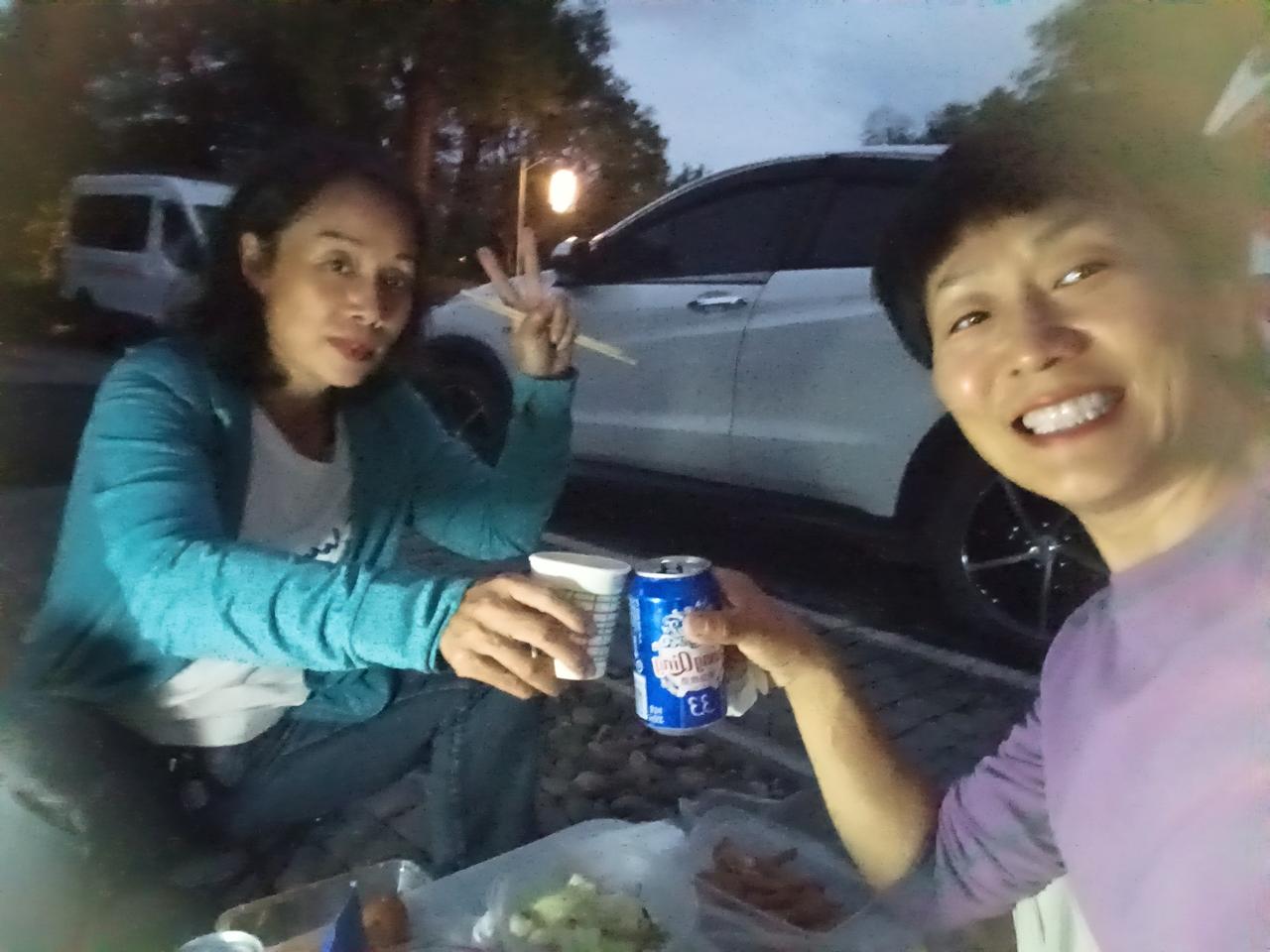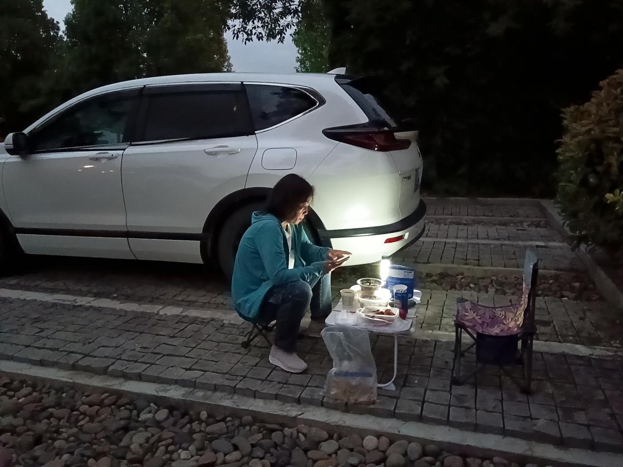 还没到重庆呢,广东妹妹就微信问我到哪了。我说还在路上,她居然说要来找我,我立马说“好啊”!其实出发前我就喊她一起去重庆,她当时说想在成都多待几天,没想到当天就变卦了,太惊喜了!我下午不到5点先到重庆,提前买了点下酒菜,把车停去秀湖公园露营地。她7点才到,我们支起小灯、摆上小桌,姐俩又开喝啦!