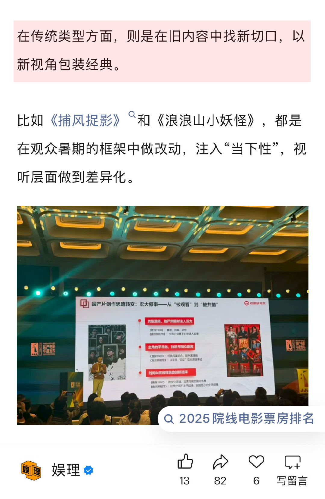 猫眼研究院从今年市场反响好的作品中总结出了国产片创作思路的转变:在宏大叙事方面,是从“被观看”到“被共情”,比如《唐探1900》《南京照相馆》都是用类型混搭的方式给严肃题材注入活力。传统类型方面则是在旧内容中找新切口,以新视角包装经典,比如《捕风捉影》《浪浪山小妖怪》,都是在注入“当下性”,在视听层面做到差异化…↓
