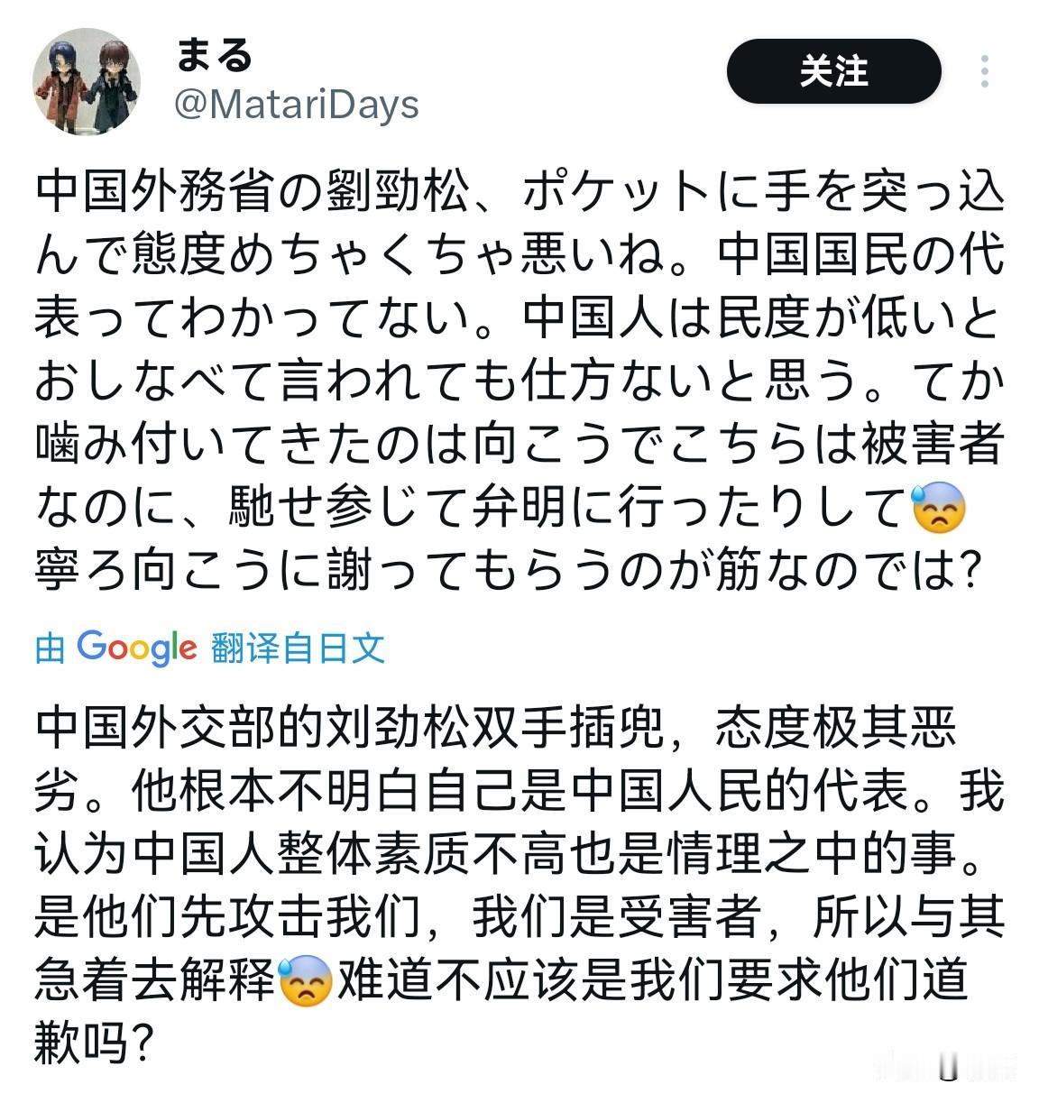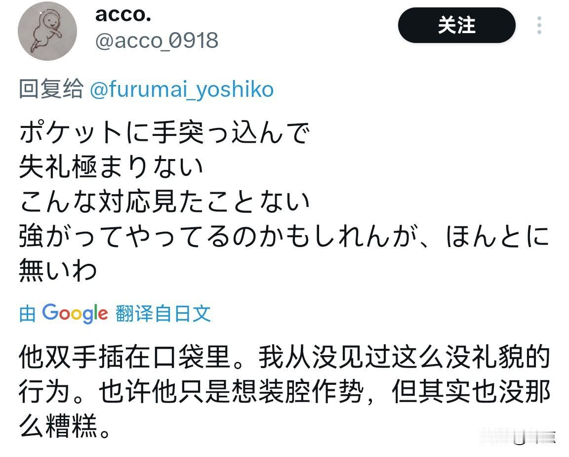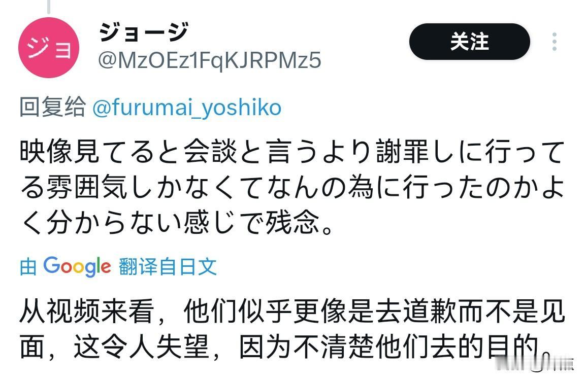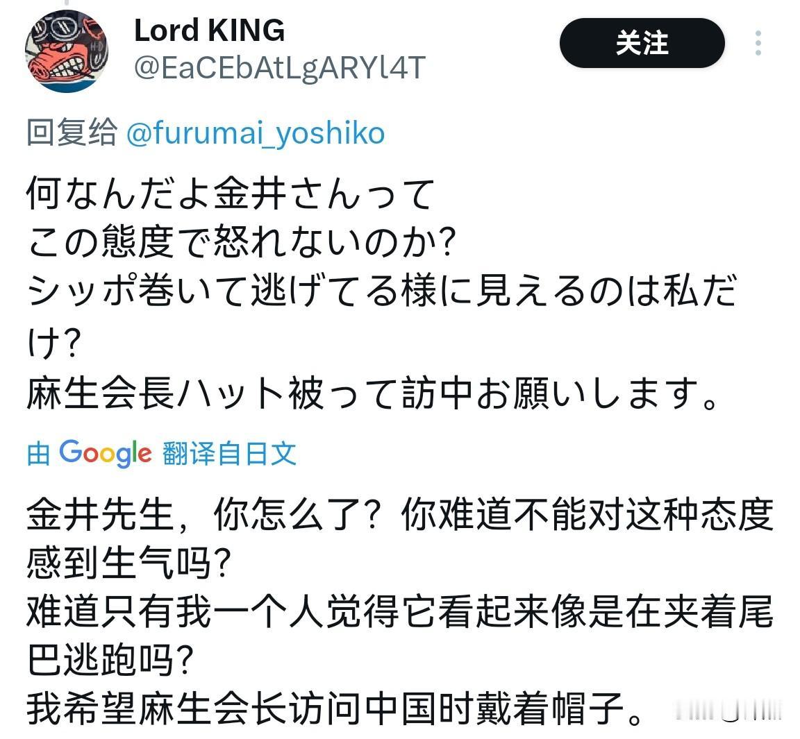 金井正彰离开时的画面被已经被日本人看到了,他们的看法总结下来就是“破防”! 这是日本人的评论: “从视频来看,他们似乎更像是去道歉而不是见面,这令人失望,因为不清楚他们去的目的。” “难道只有我一个人觉得它看起来像是在夹着尾巴逃跑吗?” “父亲责骂孩子” “他双手插在口袋里。我从没见过这么没礼貌的行为。也许他只是想装腔作势,但其实也没那么糟糕。” “这有点居高临下,也挺烦人的。他有点太自大了。” …… 对于说我们“傲慢无礼”的,我想说,中国以前太给日本面子了,但是没有用,反而让他们蹬鼻子上脸。对于小日本,就应该这个态度!