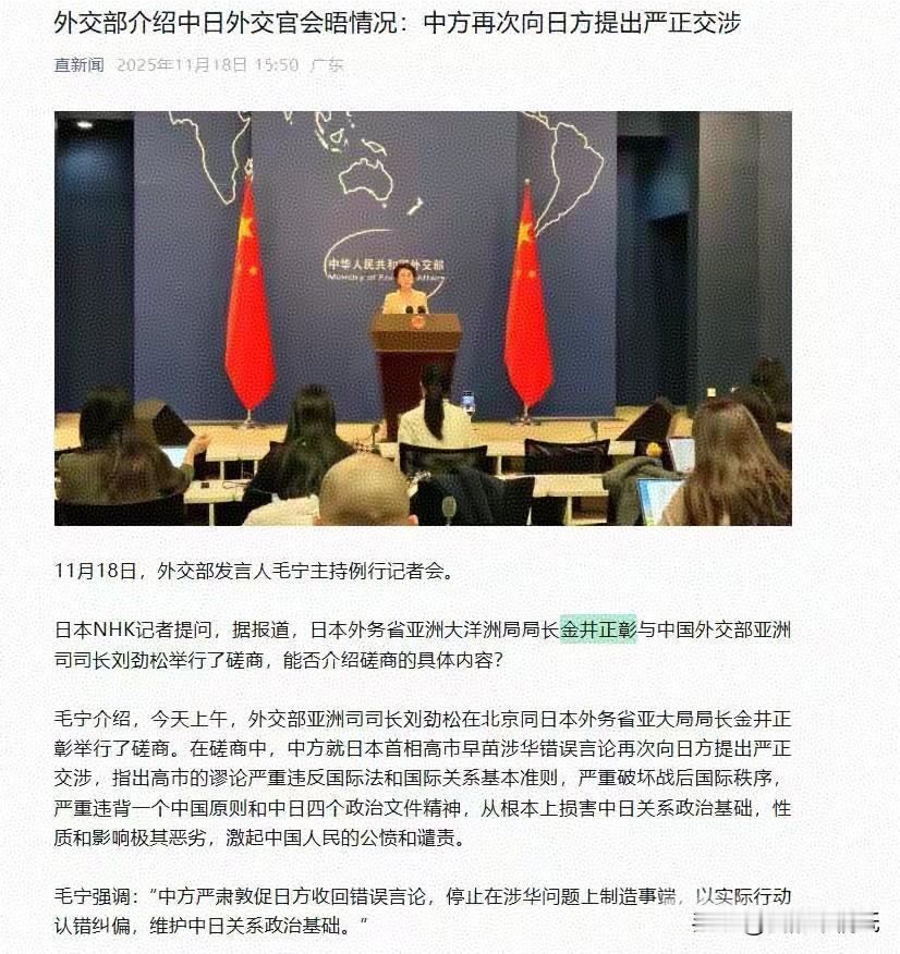 日本外交官无果而返,意料之中!三个现场细节把中日之间的地位变化展现得淋漓尽致。 一来一返,这个金井正彰全程沉默,面对记者一句话都没说。说白了,就是个“传声筒”。当然,中方根本没指望他能说出什么建设性的话。 最精彩的还是离开时的场景——中方官员胸前国徽熠熠生辉,双手插兜,神情严肃;日方代表全程低头,边走边听中方讲话,频频点头却不敢直视。这哪是平等磋商?分明是训话现场! 中方态度再明确不过:日本首相高市早苗的谬论严重破坏战后国际秩序,违背一个中国原则,性质极其恶劣。毛宁的声明字字千钧:“严肃敦促日方收回错误言论,认错纠偏!” 时代真的变了。想在中国面前耍花招?这就是下场!中国主权和尊严,不容任何挑战!