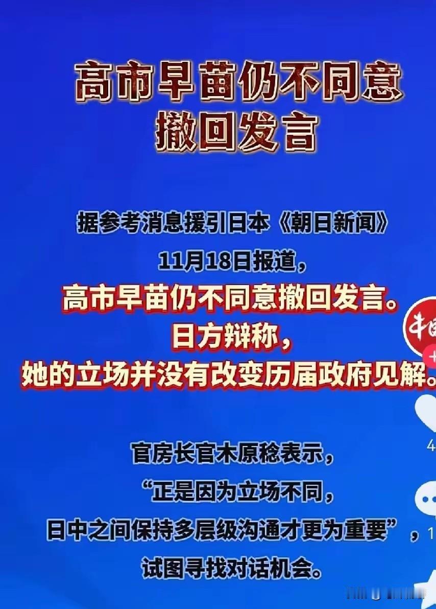 时至今日,日本仍不肯收回之前的涉台错误言论,还在狡辩高市早苗的立场并没有改变历届政府见解。对于这种嘴硬派,打口水仗已经没啥意义了,时间一长,此事估计会慢慢过去,不过,日本会落一个硬刚中国不屈服的好名声!咱们的威信则要一落千丈! 对于日本这种死不悔改的嘴硬,就跟对付无赖一样,讲道理是没用的,咱们还得再继续上强度,只有让她感到疼了,她才会低下她那高傲的头颅。相较于肉疼,嘴硬也就显得没那么重要了。这次如果不让她收回言论,后面咱们就会很被动!(图片来自网络)高市早苗内阁 高市早苗演技派