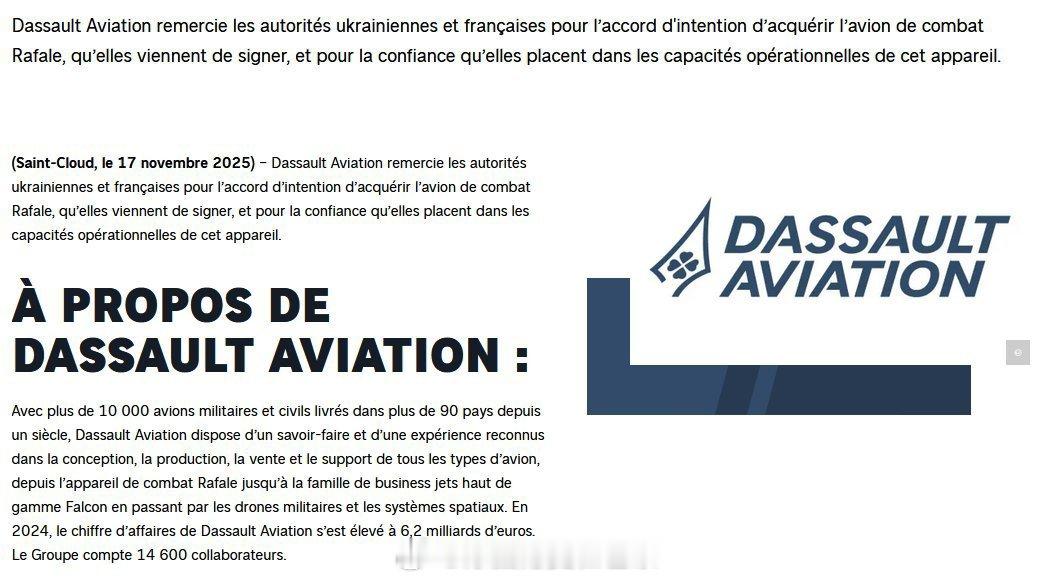 达索航空发布简短新闻稿:法国与乌克兰签署意向书,或涉及 100 架“阵风”战斗机达索航空发布一份简短声明,感谢乌克兰和法国当局刚刚签署的有关采购“阵风”(Rafale)战斗机的意向书,并感谢双方对该机型作战能力的信任。根据社交媒体上达索航空官方账号的说明,这份意向书可能涉及 多达 100 架阵风战斗机,标志着法国与乌克兰在防务合作方面迈出的重要一步。