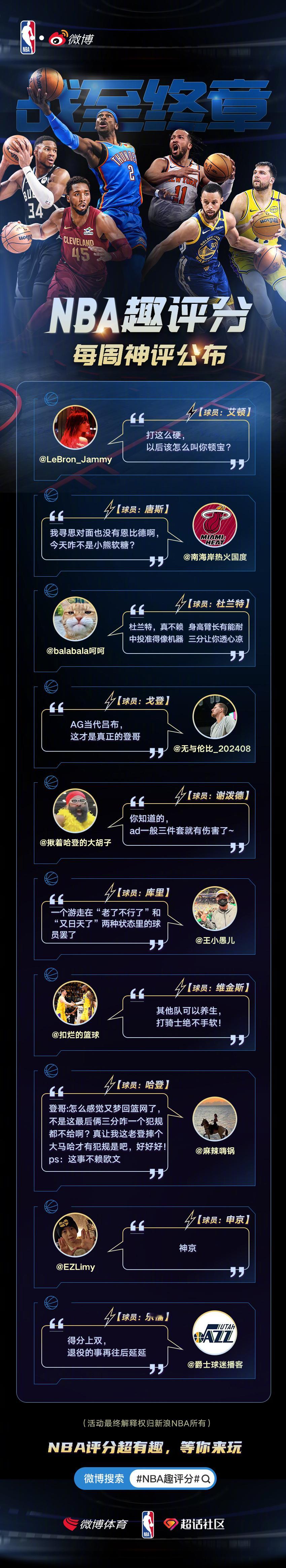 「 」首周神评来啦!小编为大家整理了一份上周NBA神评合集,一起来看看球迷们都有哪些有趣的发现和评论吧恭喜以下用户获得100元购物卡!活动仍在继续,快来打分 注:奖品将在活动结束后统一发放