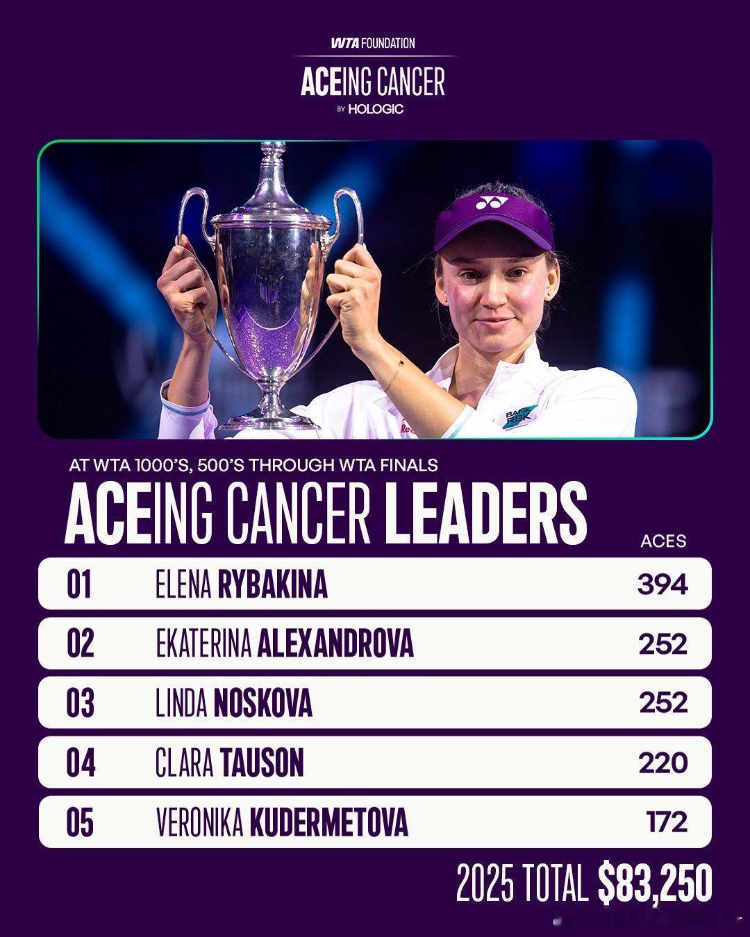 🔵2025赛季ACE榜No.1🇰🇿莱巴金娜 394记No.2🇷🇺亚历山德罗娃 252记No.3🇨🇿诺斯科娃 252记No.4🇩🇰陶森220记No.5🇷🇺库德梅托娃172记