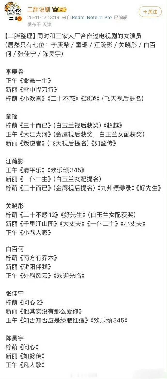 同时和三家大厂合作过电视剧的男演员仅1位:肖战女演员:童瑶/江疏影/ 关晓彤/白百何/张佳宁/陈昊宇……