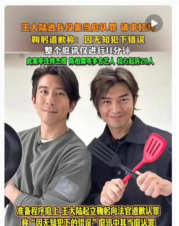 王大陆是真敢认呀!他态度也太直接了 今天开庭他穿黑衣戴口罩,进法庭没理记者,一上庭就起立鞠躬,跟法官说自己“因无知犯的错”,三个罪名全认了,还把给造假头目的360万账都说清楚了。 律师说他坦白态度好,求法官从轻判,要么罚金要么缓刑。之前他逃避兵役失败,今年3月就去服替代役了,现在又当庭认账,也算没躲着。 犯错了能这么直接认,是不是比死扛着强?