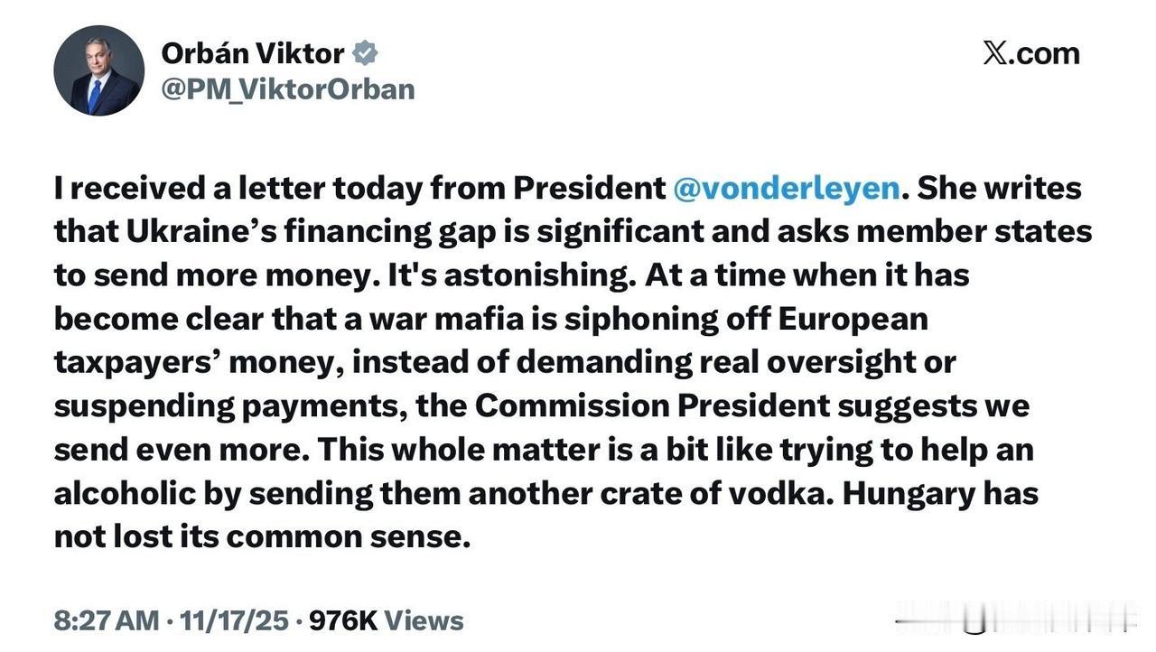 Orban发文指责欧盟委员会主席,称她再次要求成员国向乌克兰提供资金令人震惊。 “我今天收到了来自@vonderleyen主席的一封信。她在信中写道,乌克兰的资金缺口巨大,并呼吁各成员国提供更多资金。这令人震惊。在战争黑手党正大肆侵吞欧洲纳税人钱财的事实已然清晰的当下,欧盟委员会主席非但没有要求真正的监管或暂停付款,反而建议我们再加钱。整件事就像给酒鬼再送一箱伏特加,试图“帮忙”。匈牙利还没有失去理智。 ”