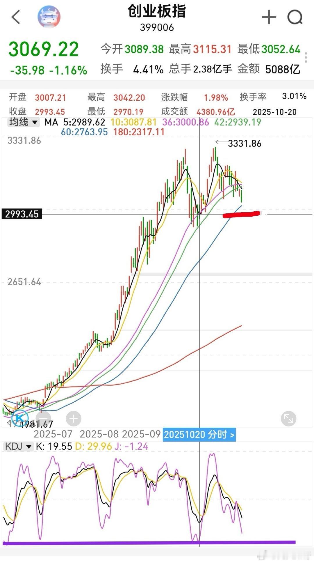 大家早!昨晚美股继续跌,科技股尤其明显,但医疗医药和生活用品是涨的。对英伟达看空的声音比较多,导致美股芯片科技股走弱。上周开始,我每天基本都要说一句,规避涨得高的大盘股,尽管也有机会,但风险高一不留神就站岗。昨天涨得猛的中小盘股也熄火了,主要是关禁闭,导致市场情绪变冷。今天看创业板3037附近的支撑力度,预计暂时不去日线极值2996附近。当然有时候主力为了砸出恐慌盘,会去日线极值。这一点我们要防备。重点看3037附近的速率和力度。目前半小时kdj在地板上摩擦。 继续关注消费板块,生活类消费,医药医疗也算生活类板块。关注AI应用的发酵,毕竟未来前景广阔。
