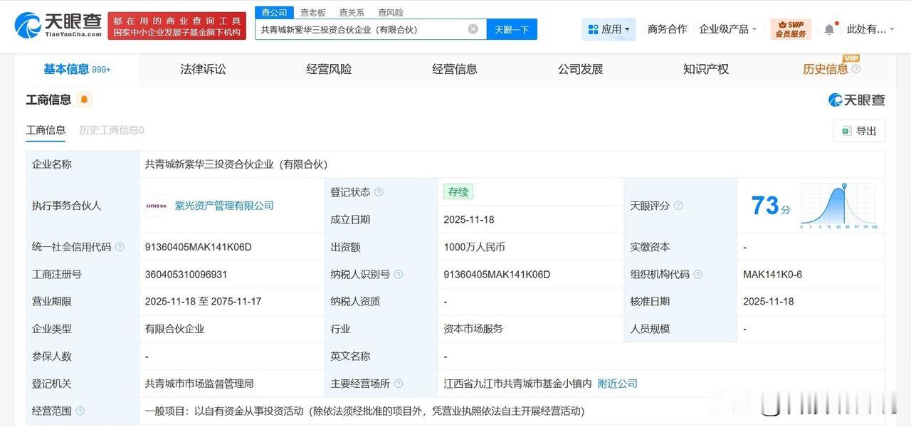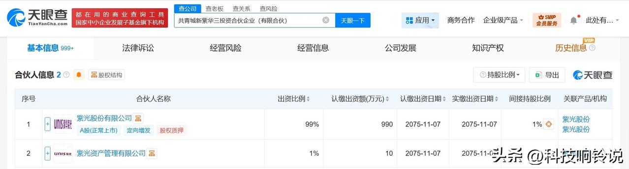【紫光股份在共青城成立投资合伙企业 出资额1000万】 天眼查工商信息显示,近日,共青城新紫华三投资合伙企业(有限合伙)成立,执行事务合伙人为紫光资产管理有限公司,出资额1000万人民币,经营范围为以自有资金从事投资活动。合伙人信息显示,该合伙企业由紫光股份及旗下紫光资产管理有限公司共同出资。 天眼查信息: