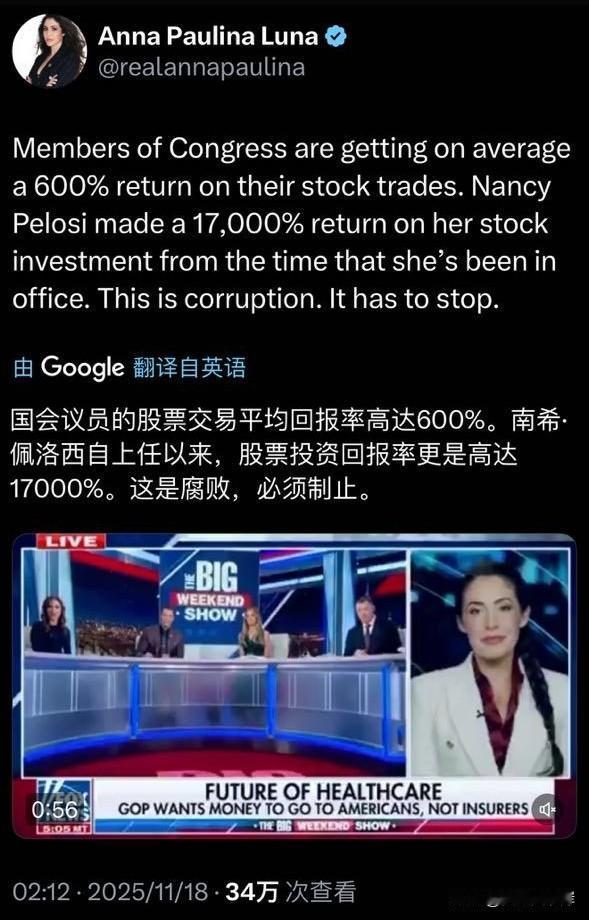 国会议员的股票交易平均回报率高达600%,Nancy Pelosi自上任以来,股票投资回报率更是高达17000%。这是腐败,必须停止。