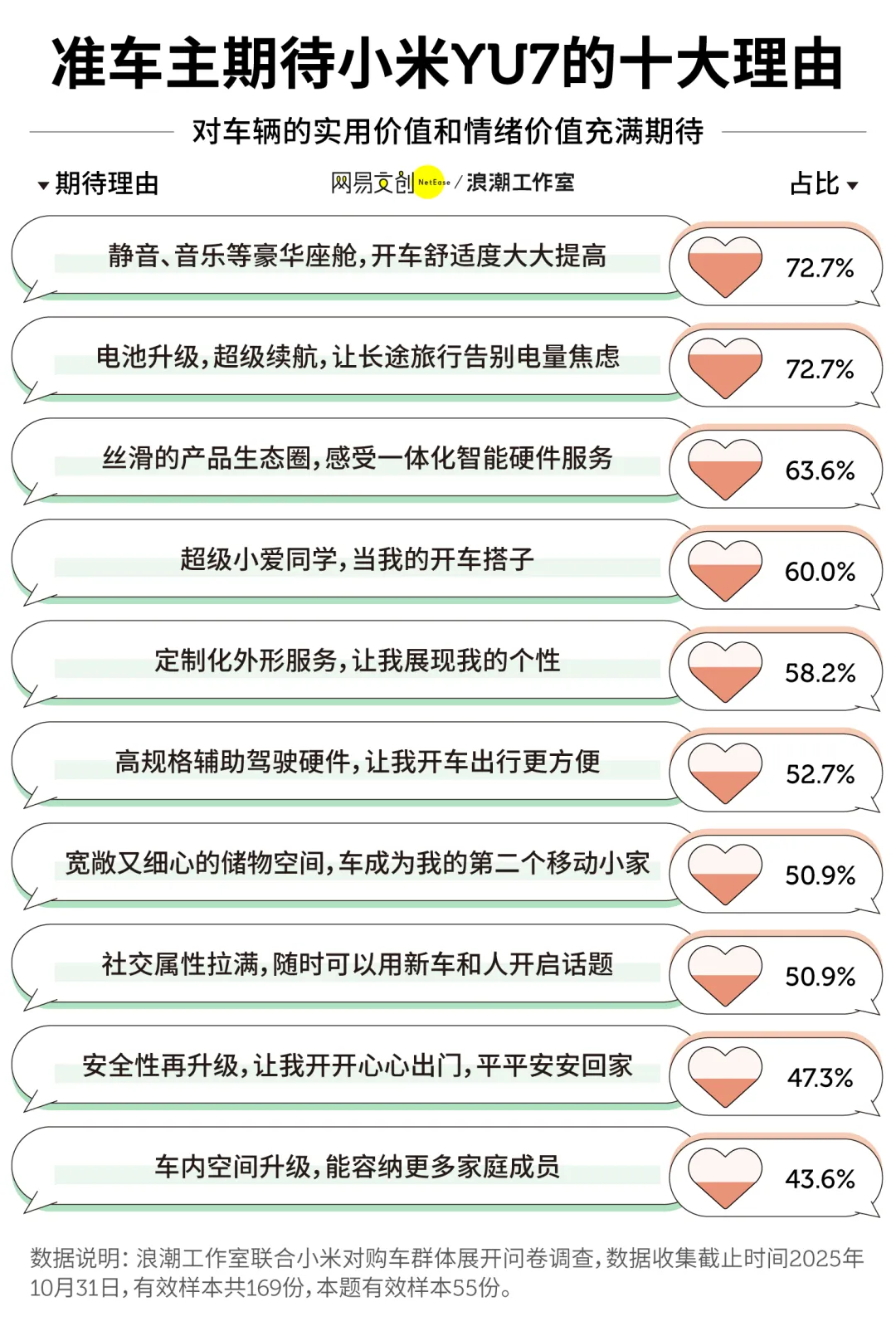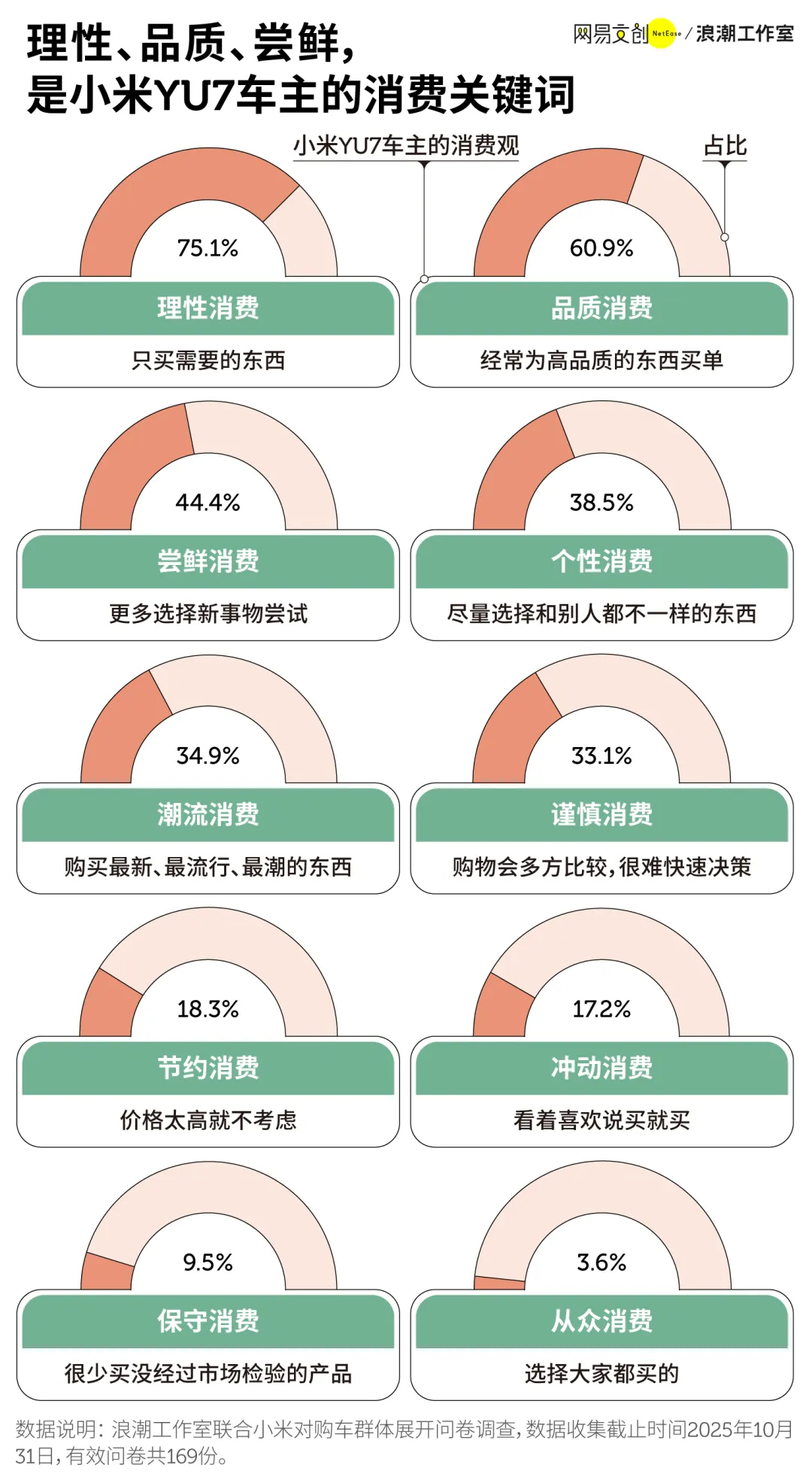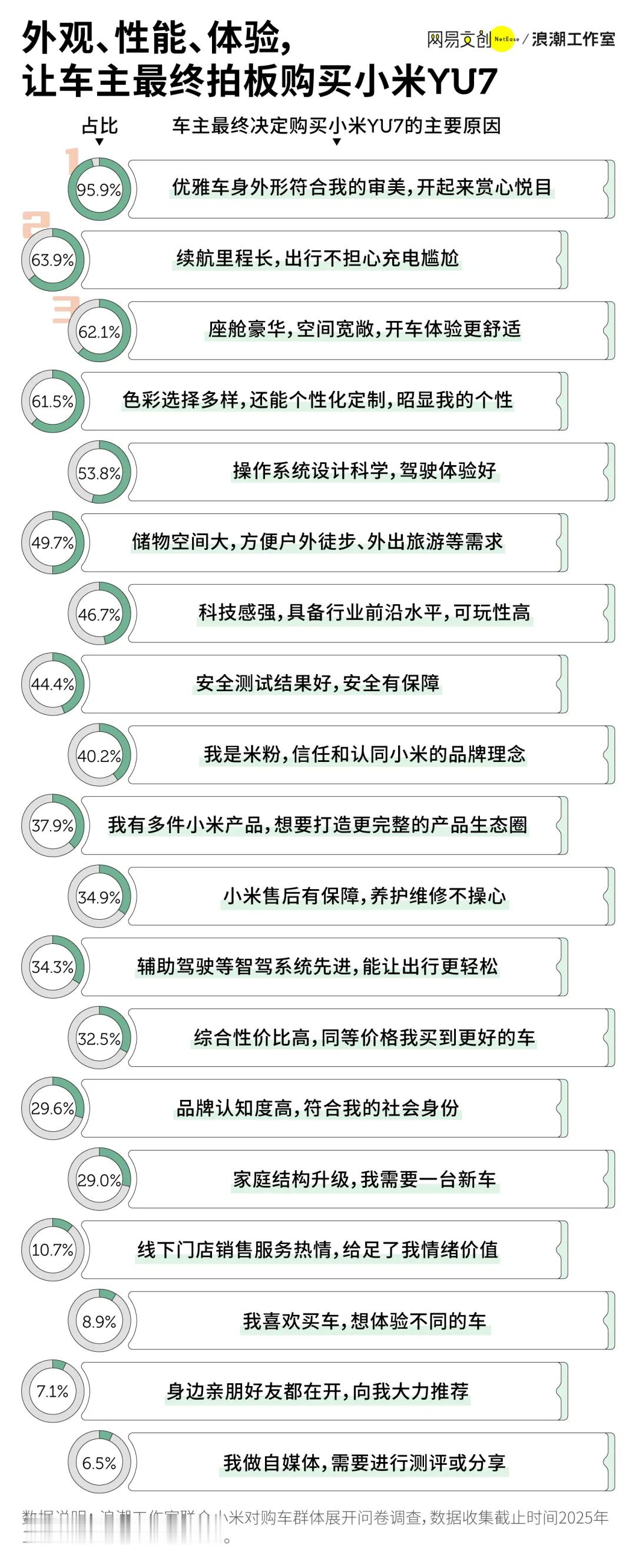 小米汽车真正成功的地方在于他能让很多原本不打算买车的人下决心买车了,SU7是如此,YU7也是如此。YU7用户当中有约40%的人是第一次买车,约80%的人是第一次购买电车,比例非常之夸张,这对于我国新能源战略和新能源汽车产业无疑是非常好的。除开关键的颜值之外,YU7也凭借操作系统、安全性和储物空间等优点留住了很多消费者,并且米粉群体在YU7的用户画像当中仅占到40%,可见小米的品牌力和产品力在路人用户当中也是受到非常高的认同的,始于颜值,终于全能的产品力,才是YU7的制胜关键。