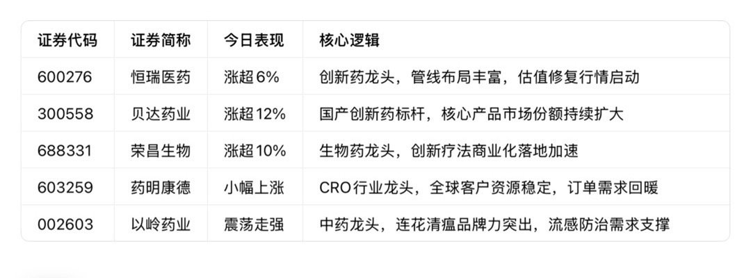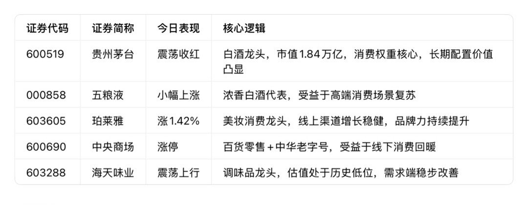 2025年11月19日热门板块龙头股名单+细分解读财哥这就给大家整理今日核心热门板块的龙头标的,结合资金流向和题材逻辑,方便大家精准参考:一、大消费板块(今日主线,内需修复+估值修复)核心龙头股证券代码 证券简称 今日表现 核心逻辑 600519 贵州茅台 震荡收红 白酒龙头,市值1.84万亿,消费权重核心,长期配置价值凸显 000858 五粮液 小幅上涨 浓香白酒代表,受益于高端消费场景复苏 603605 珀莱雅 涨1.42% 美妆消费龙头,线上渠道增长稳健,品牌力持续提升 600690 中央商场 涨停 百货零售+中华老字号,受益于线下消费回暖 603288 海天味业 震荡上行 调味品龙头,估值处于历史低位,需求端稳步改善 细分亮点• 白酒板块:山西汾酒、泸州老窖同步走强,板块资金承接力强,机构抱团特征明显;• 零售消费:丽人丽妆、太平鸟实现两连板,叠加电商渠道优化与消费升级逻辑,成为短线热点。二、医药生物板块(两连阳,资金净流入显著)核心龙头股证券代码 证券简称 今日表现 核心逻辑 600276 恒瑞医药 涨超6% 创新药龙头,管线布局丰富,估值修复行情启动 300558 贝达药业 涨超12% 国产创新药标杆,核心产品市场份额持续扩大 688331 荣昌生物 涨超10% 生物药龙头,创新疗法商业化落地加速 603259 药明康德 小幅上涨 CRO行业龙头,全球客户资源稳定,订单需求回暖 002603 以岭药业 震荡走强 中药龙头,连花清瘟品牌力突出,流感防治需求支撑 细分亮点• 创新药赛道:泰格医药、康龙化成涨幅超5%,受益于政策支持与研发投入增加;• 医药ETF(159929)涨超2%,近60日资金净流入近5亿元,成为板块趋势性行情的重要信号。三、其他短线热门板块龙头• AI智慧政务:浪潮软件(3连板)、榕基软件(4连板),叠加数字政府政策催化,短线人气高涨;• 国企改革:中水渔业(涨停)、航天发展(4连板),受益于国企估值重塑与业务转型预期;• 流感防治:特一药业、华兰疫苗、金石亚药,受冬季流感高发预期带动,资金关注度提升。操作提示以上龙头股涵盖长线价值标的与短线热点标的,大家需结合自身操作风格选择:价值型选手可重点关注消费、医药板块中业绩确定性强的龙头;短线选手需紧盯连板标的的量能变化,回避高位追涨风险。