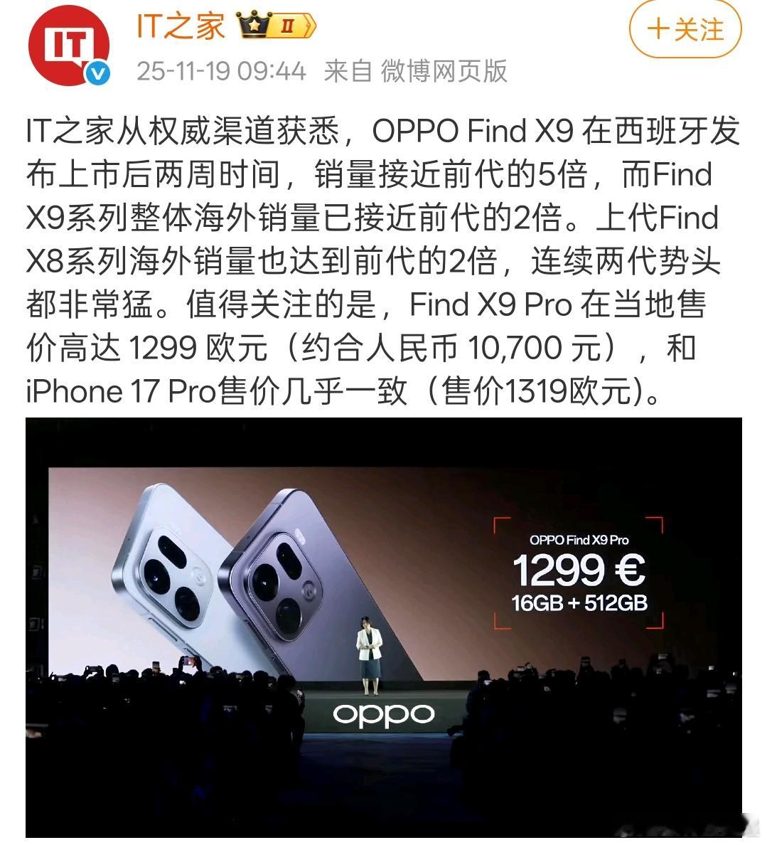 系列在海外卖的挺不错啊,在西班牙发布上市后两周时间,销量接近前代的5倍!整体海外销量已接近前代的2倍,其中Find X9 Pro海外销量几乎是上代的3倍!