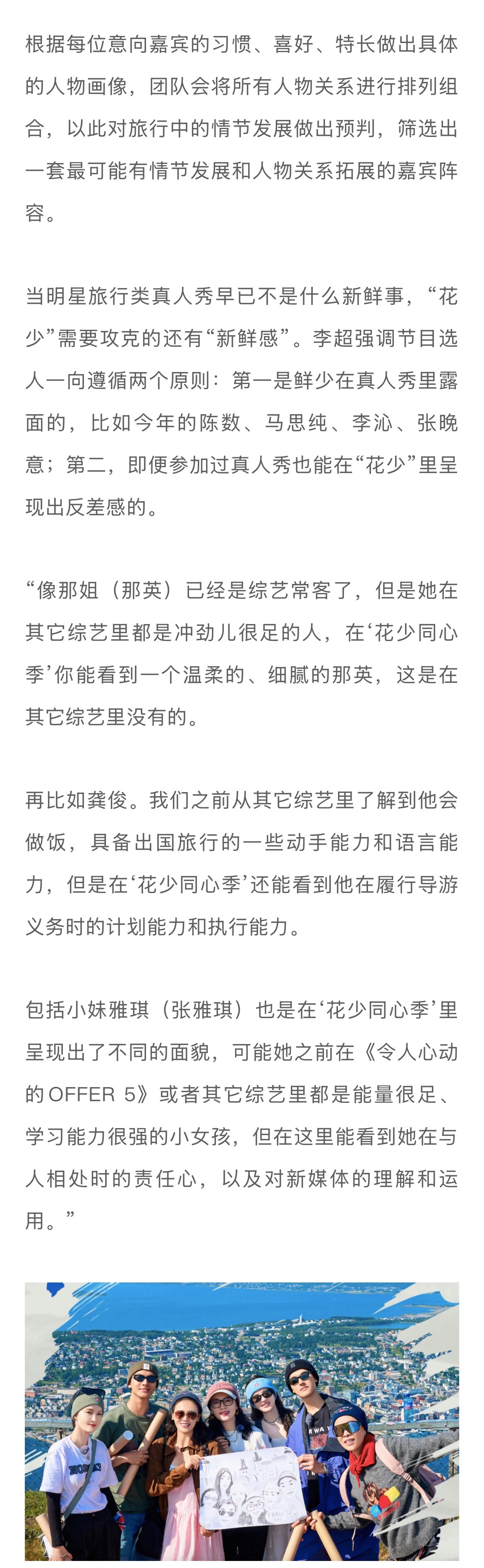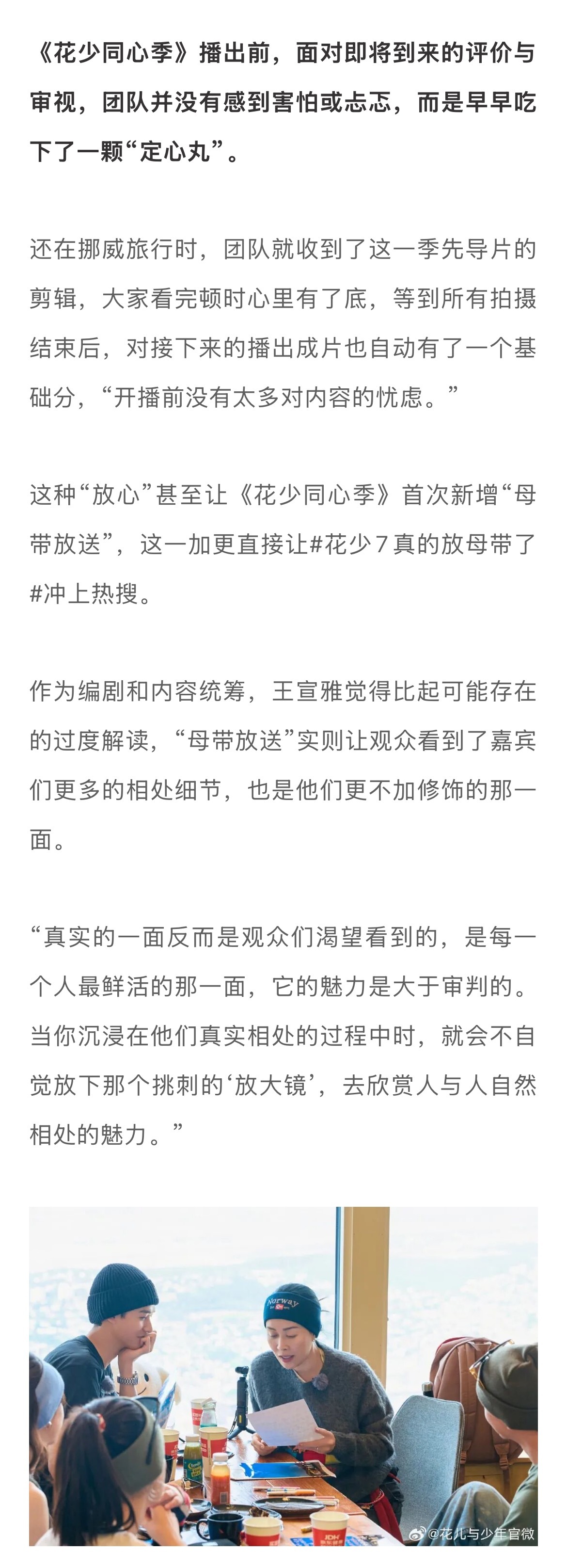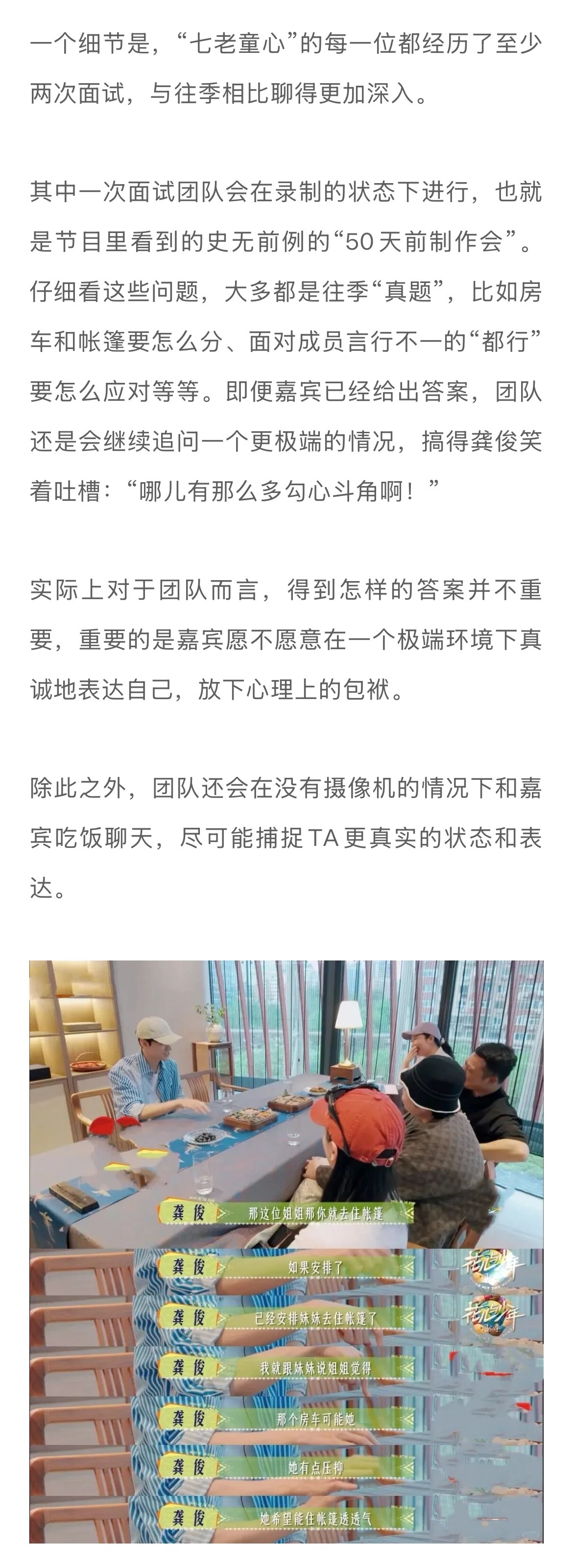 由那英、陈数、马思纯、李沁、张雅琪、龚俊、张晚意组成的“七老童心”,被观众总结为“全员淡人”。这样的“淡人感”是幕后团队主动促成的:筛选嘉宾时,团队特别与前几季做出区隔,寻求情绪更稳定的艺人,哪怕TA的表达有时不够热烈。据新浪娱乐 工作室了解,“七老童心”的每一位都经历了至少两次面试,与往季相比聊得更加深入。其中一次面试团队会在录制的状态下进行,也就是节目里看到的史无前例的“50天前制作会”。本季节目播出前,面对即将到来的评价与审视,团队没有感到害怕或忐忑,而是早早吃下了一颗“定心丸”。谈及所谓的“母带放送”话题词,编剧和内容统筹王宣雅认为这也是在让观众看到了嘉宾们更多的相处细节,“真实的一面反而是观众们渴望看到的,是每一个人最鲜活的那一面,它的魅力是大于审判的…真正旅行的时候,每个人都在努力做到不掉队。即便有人身体不适,也会提前和成员们沟通。那些美好他们全部都看到了,也让观众跟着他们体验到了,这点还是让我们挺感动的。”此外,“花少”需要攻克的还有“新鲜感”。总导演李超强调节目选人一向遵循两个原则:第一是鲜少在真人秀里露面的,比如今年的陈数、马思纯、李沁、张晚意;第二,即便参加过真人秀也能在“花少”里呈现出反差感的。“在‘花少同心季’你能看到一个温柔的、细腻的那英,这是在其它综艺里没有的。还能看到龚俊在履行导游义务时的计划能力和执行能力。包括小妹雅琪(张雅琪)也呈现出了不同的面貌…”↓