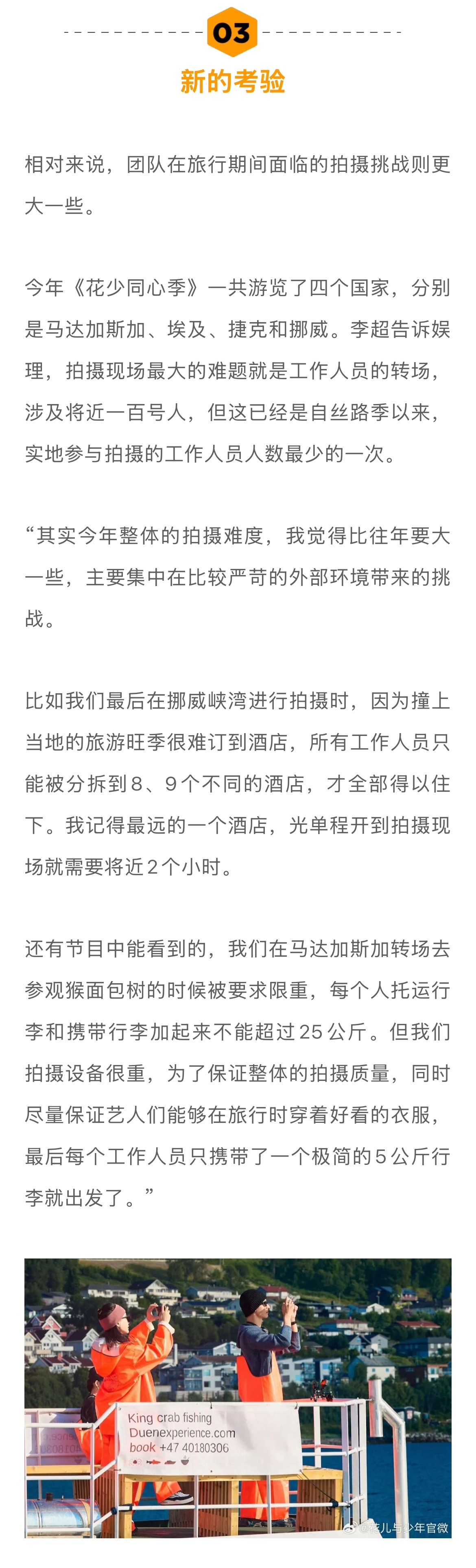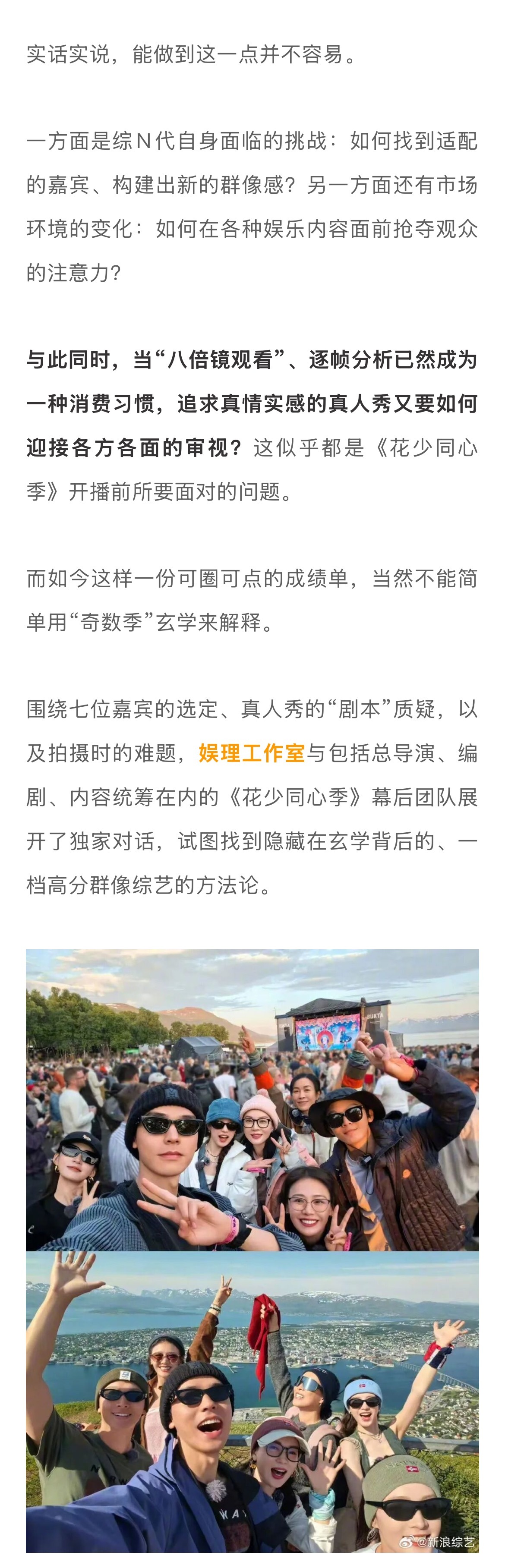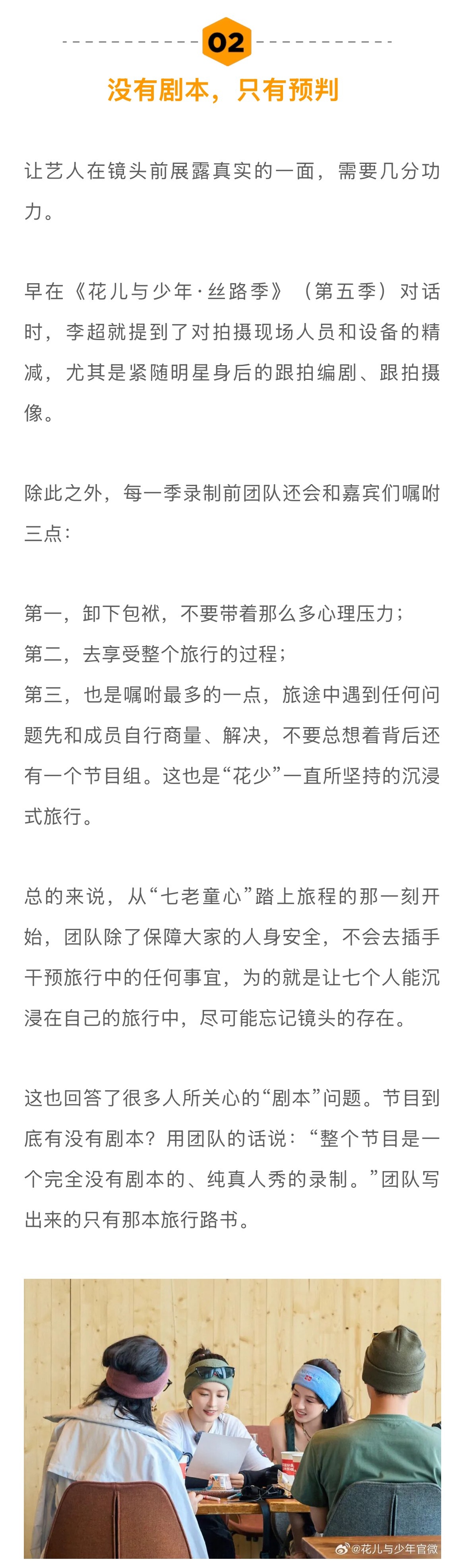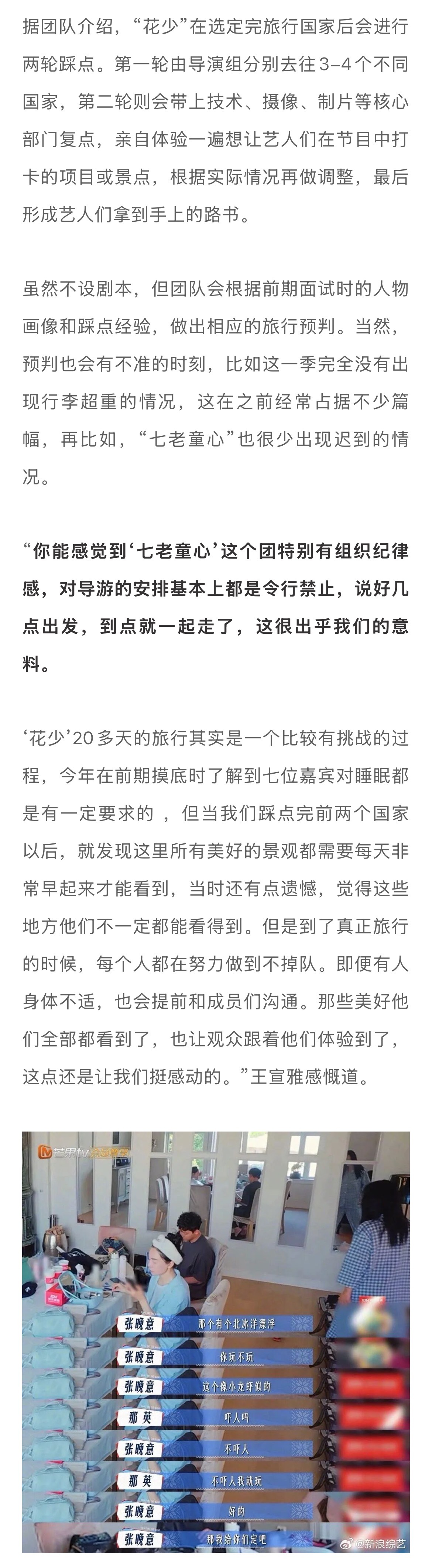 由那英、陈数、马思纯、李沁、张雅琪、龚俊、张晚意组成的“七老童心”,被观众总结为“全员淡人”。这样的“淡人感”是幕后团队主动促成的:筛选嘉宾时,团队特别与前几季做出区隔,寻求情绪更稳定的艺人,哪怕TA的表达有时不够热烈。据新浪娱乐 工作室了解,“七老童心”的每一位都经历了至少两次面试,与往季相比聊得更加深入。其中一次面试团队会在录制的状态下进行,也就是节目里看到的史无前例的“50天前制作会”。本季节目播出前,面对即将到来的评价与审视,团队没有感到害怕或忐忑,而是早早吃下了一颗“定心丸”。谈及所谓的“母带放送”话题词,编剧和内容统筹王宣雅认为这也是在让观众看到了嘉宾们更多的相处细节,“真实的一面反而是观众们渴望看到的,是每一个人最鲜活的那一面,它的魅力是大于审判的…真正旅行的时候,每个人都在努力做到不掉队。即便有人身体不适,也会提前和成员们沟通。那些美好他们全部都看到了,也让观众跟着他们体验到了,这点还是让我们挺感动的。”此外,“花少”需要攻克的还有“新鲜感”。总导演李超强调节目选人一向遵循两个原则:第一是鲜少在真人秀里露面的,比如今年的陈数、马思纯、李沁、张晚意;第二,即便参加过真人秀也能在“花少”里呈现出反差感的。“在‘花少同心季’你能看到一个温柔的、细腻的那英,这是在其它综艺里没有的。还能看到龚俊在履行导游义务时的计划能力和执行能力。包括小妹雅琪(张雅琪)也呈现出了不同的面貌…”↓