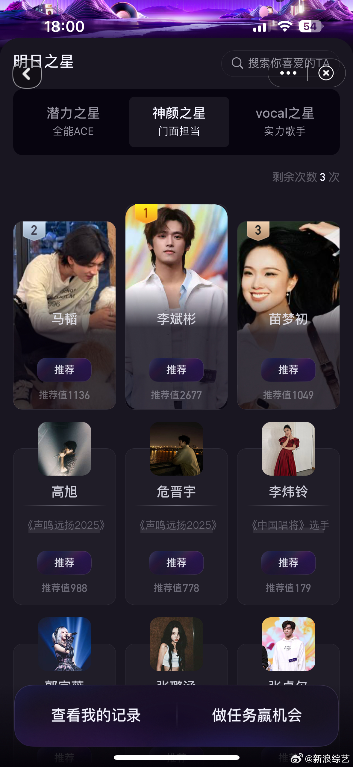 推荐持续ing!潜力之星✨、神颜之星✨、vocal之星✨三大赛道每日排行TOP6更新喽!快来看看你推荐的TA有没有上榜微博多场景曝光、优质热点推荐、线下演出等资源等你解锁还有签名照、录制门票、翻牌互动等惊喜好礼等你来拿快来 为最闪耀的Ta投票吧>> 【潜力之星】全能ACE《声鸣远扬2025》 《声鸣远扬2025》 《声鸣远扬2025》 《声鸣远扬2025》 《声鸣远扬2025》 《声鸣远扬2025》 【神颜之星】门面担当《声鸣远扬2025》 《声鸣远扬2025》 《声鸣远扬2025》 《声鸣远扬2025》 《声鸣远扬2025》 《中国唱将》李炜铃 【vocal之星】实力歌手《声鸣远扬2025》 《声鸣远扬2025》 《声鸣远扬2025》 《声鸣远扬2025》 《声鸣远扬2025》 《声鸣远扬2025》(数据时间截止11.19日18:00)