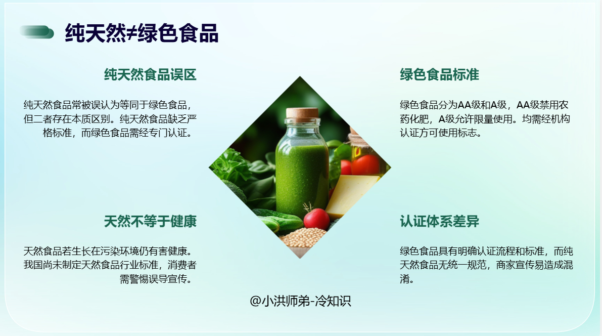 纯天然食品对人体绝对无害目前,不少食品都在包装上打着“纯天然”、“无公害”、“无污染”、“野生”、“有机”等字眼儿吸引消费者的眼球。很多人认为,“纯天然”就是“绿色食品”、“食用安全”的代名词。然而,“纯天然”食品并非“绿色食品”。商家宣称的“纯天然食品”与“绿色食品”完全是两个概念,“纯天然食品”是指在自然环境下生长的食品,并没有一个严格的控制标准。而所谓“绿色食品”是“无公害食品”,指的是无污染、无毒害、安全优质的食品。绿色食品分为AA级和A级两种,AA级不使用任何农药、化肥和人工合成激素;A级则允许限量使用限定的农药、化肥和合成激素。“绿色食品”都要经专门机构批准才能使用“绿色食品”的标志。有些天然的产品由于在受污染的地方生长,也不是健康的食品,所以并不是“天然”的就是健康的。在我国的认证项目中,还没有“天然”的行业标准。|||