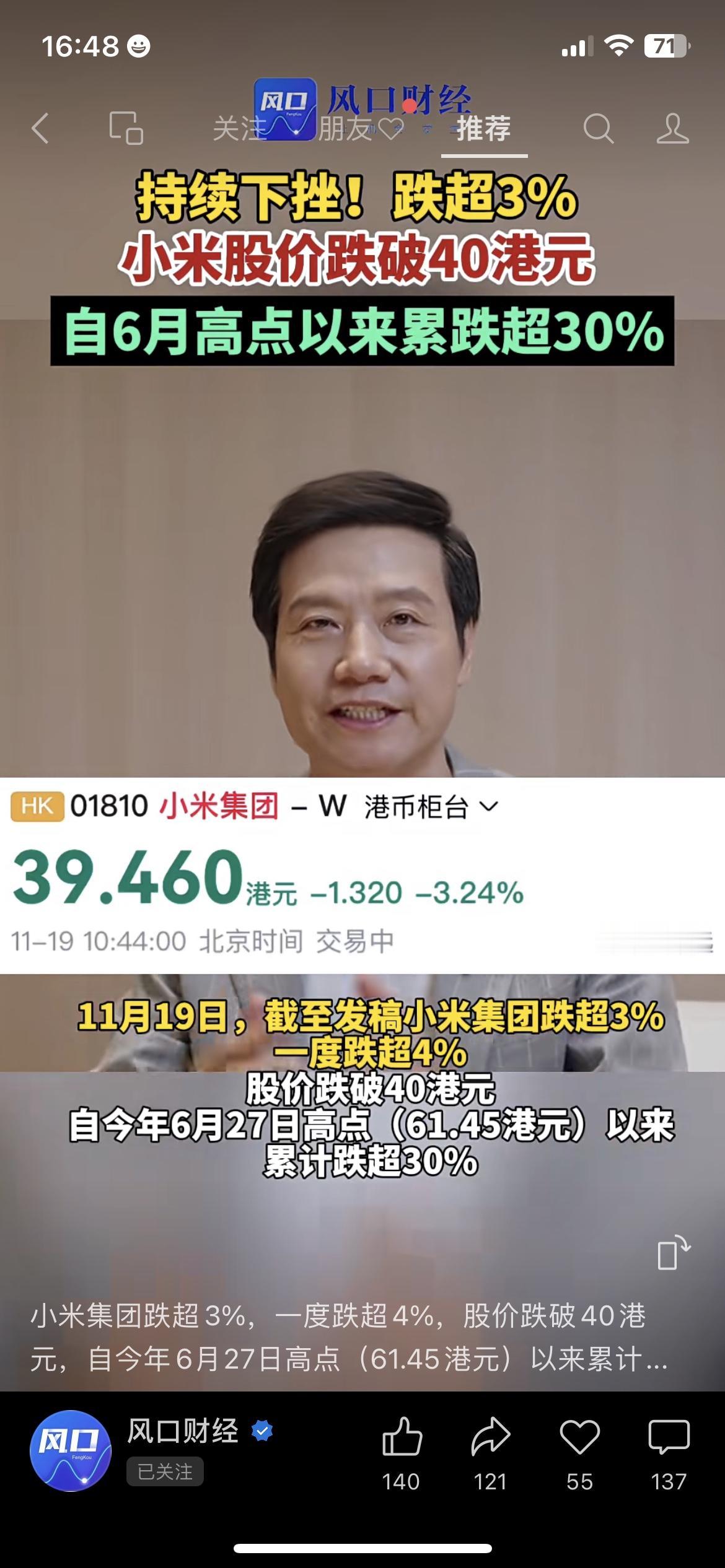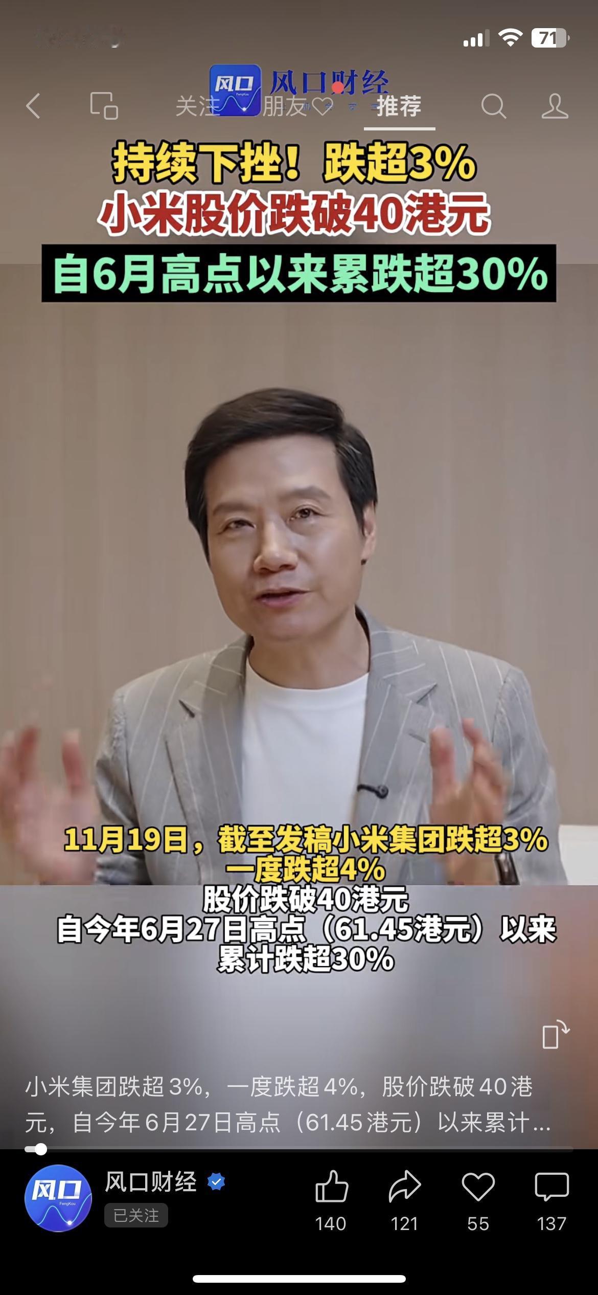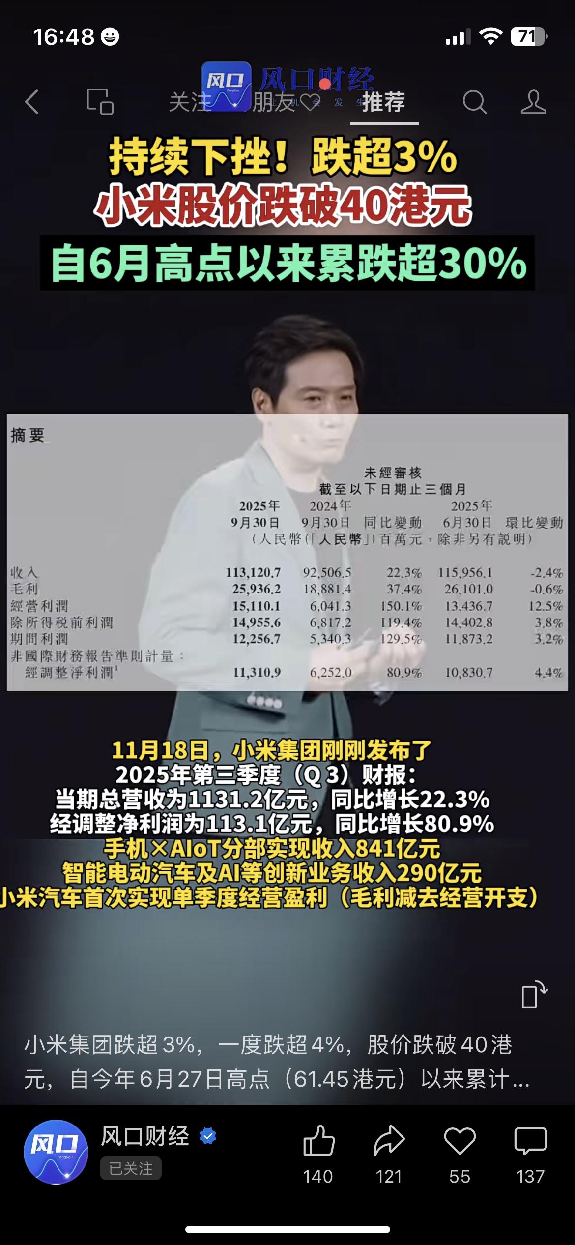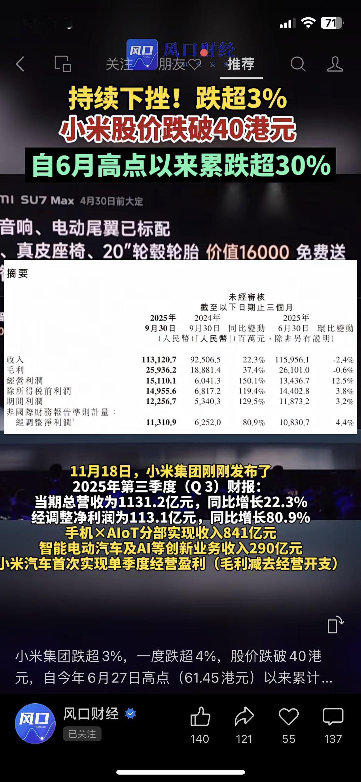 小米疯了?净利暴增80%股价却跌30%,到底在搞啥? 谁懂小米这操作啊!三季度财报直接炸了——营收1131亿,净利暴涨80.9%创历史新高! 汽车更牛,单季卖10万台还首次盈利,每辆净赚6400多块! 结果股价从6月高点跌超30%,直接跌破40港元! 其实隐患很真实:手机业务受存储芯片涨价压力,毛利率下滑;卢伟冰都预警,明年汽车补贴减半,毛利率可能再降;加上机构空头抛售,短期确实没啥催化剂。 一边是2367亿现金储备的底气,一边是跌不停的股价。你觉得小米是被低估了该抄底,还是后续风险真的大?评论区聊聊~ 小米财报解读 港股行情 新能源汽车 科技股动态小米汽车估值 小米发展前景 雷军小米市值 小米股票市值