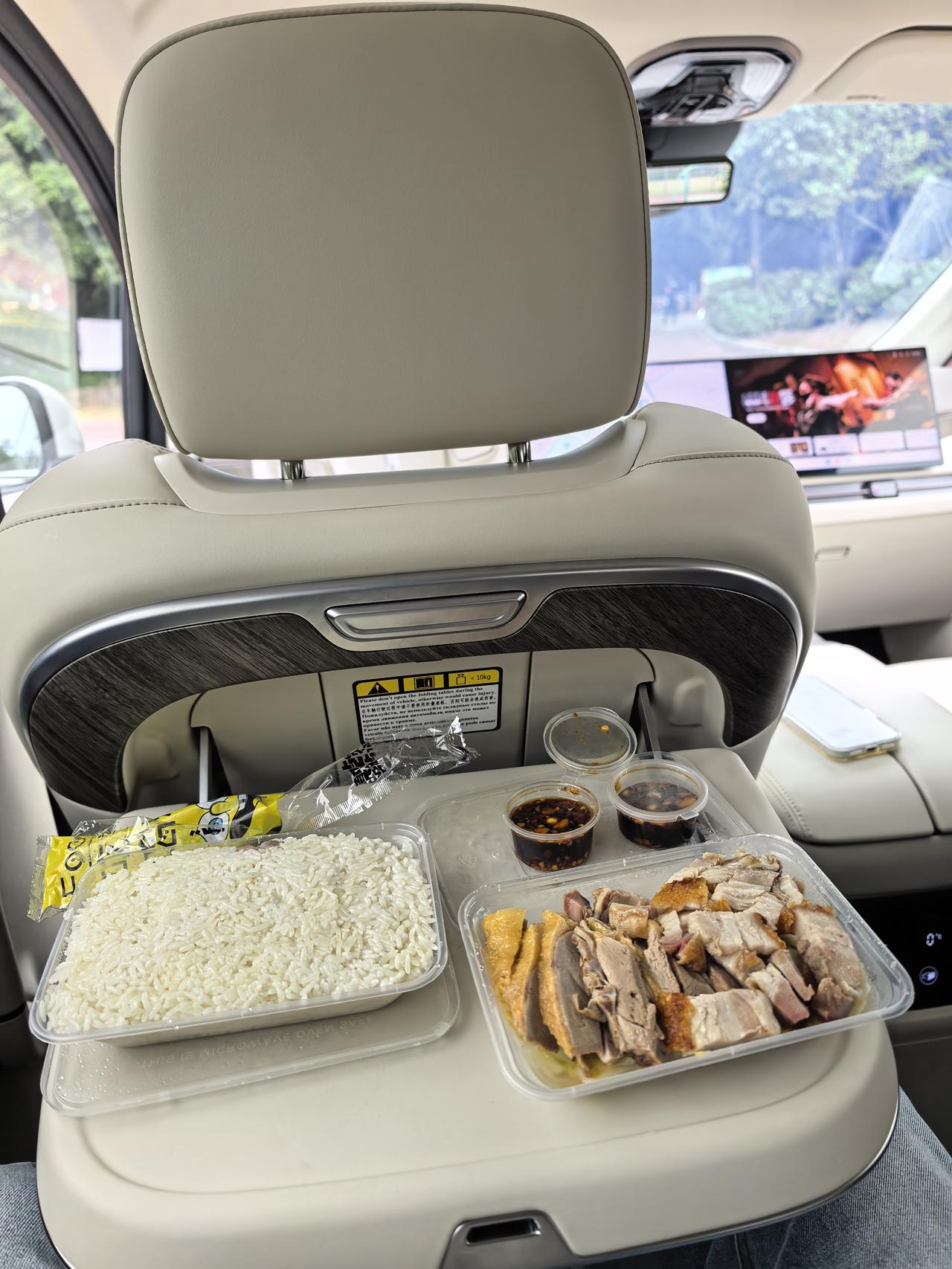 后排小桌板的最佳使用场景,可能是吃盒饭!
