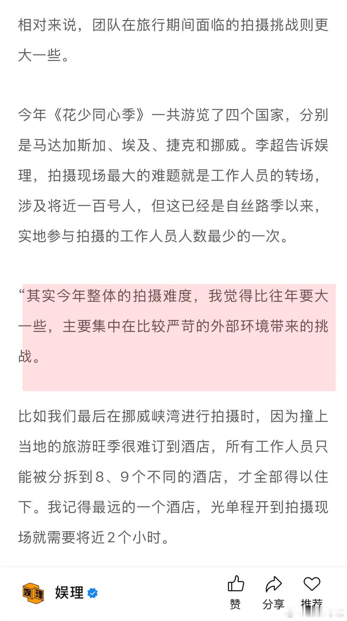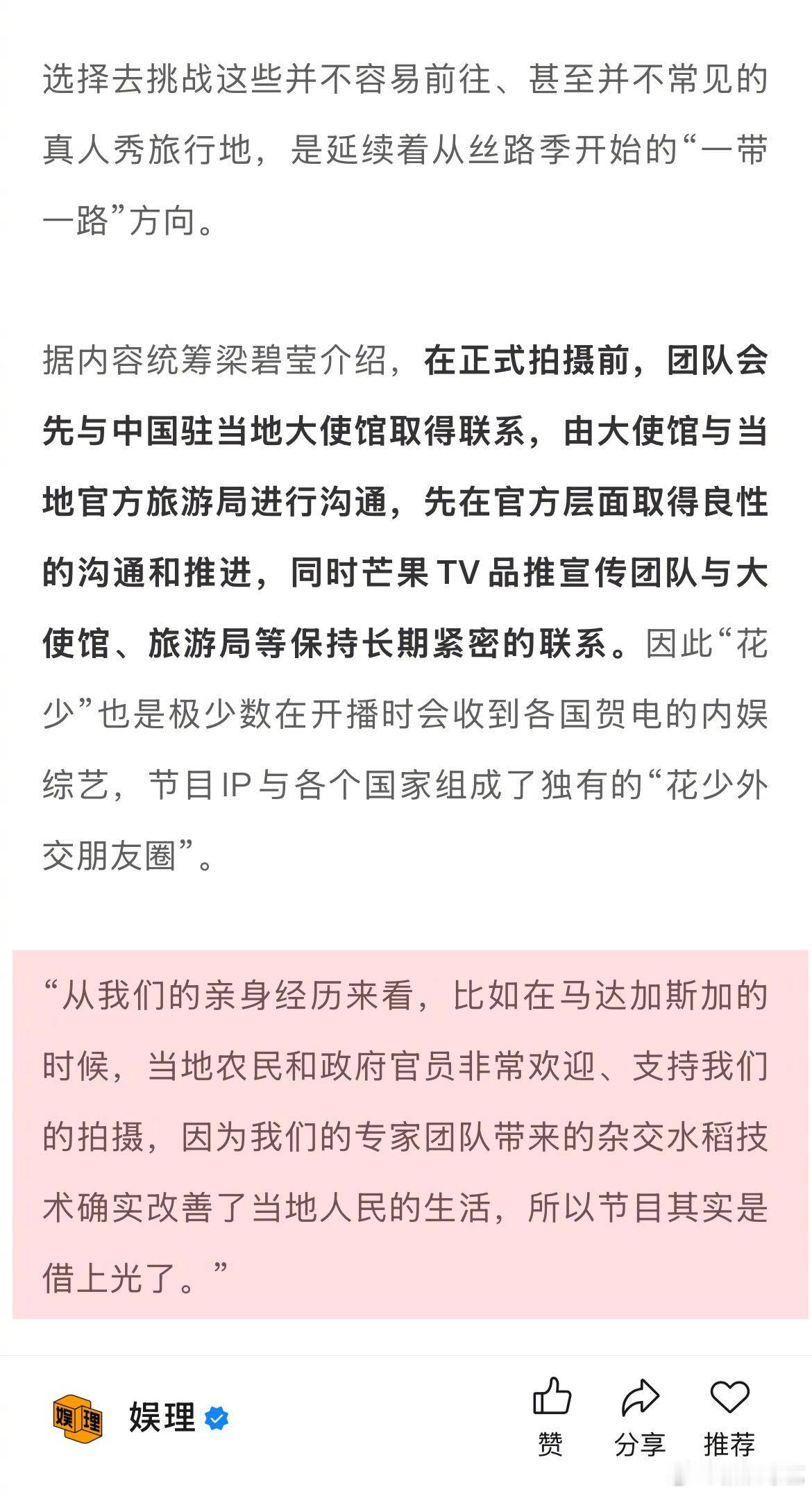 据 内容统筹梁碧莹介绍,在正式拍摄前,团队会先与中国驻当地大使馆取得联系,由大使馆与当地官方旅游局进行沟通,先在官方层面取得良性的沟通和推进。因此“花少”也是极少数在开播时会收到各国贺电的内娱综艺,节目IP与各个国家组成了独有的“花少外交朋友圈”