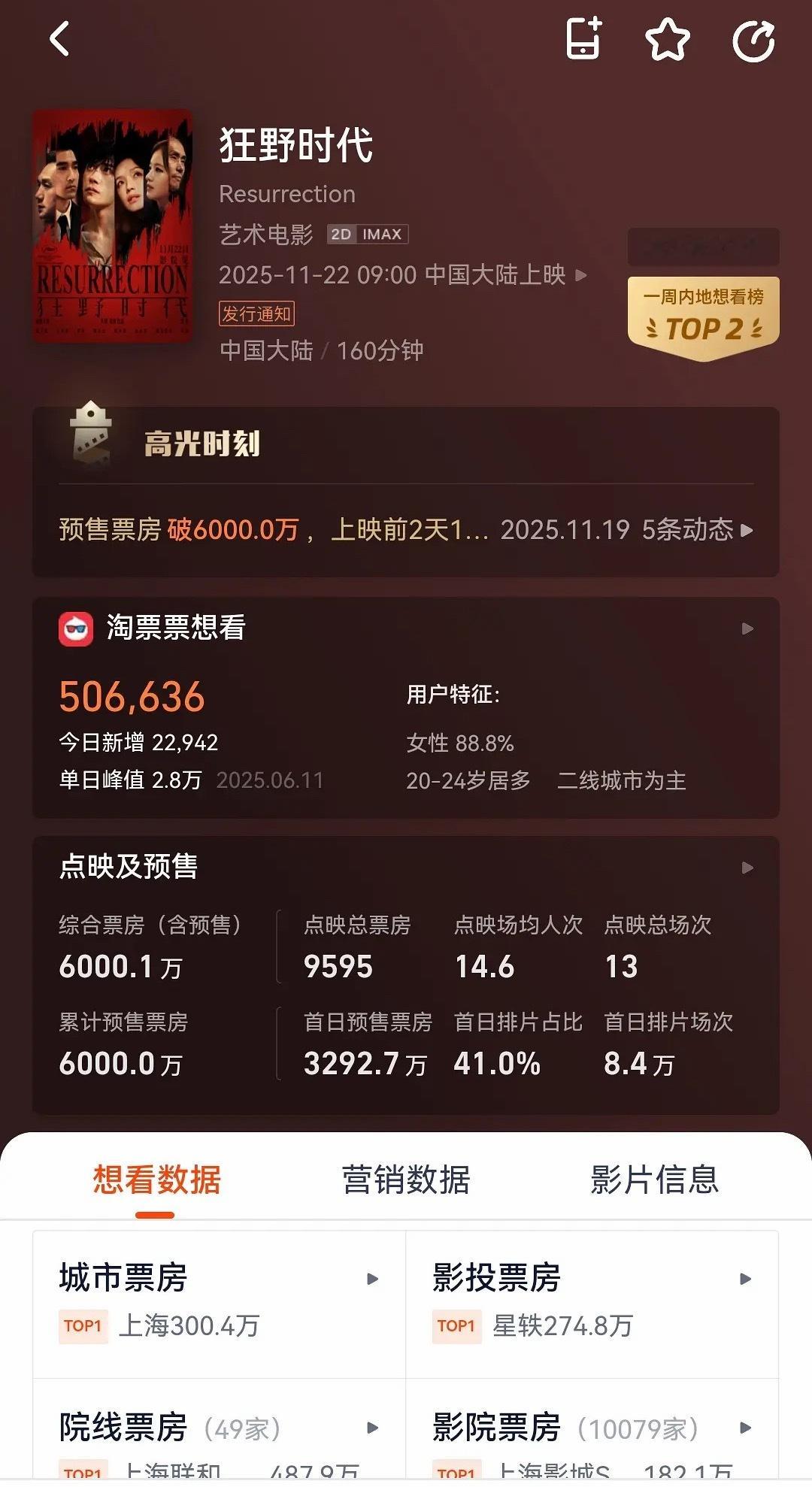 电影《狂野时代》预售总票房破6000万,流量演员号召力就是强,艺术电影预售新纪录了吧。