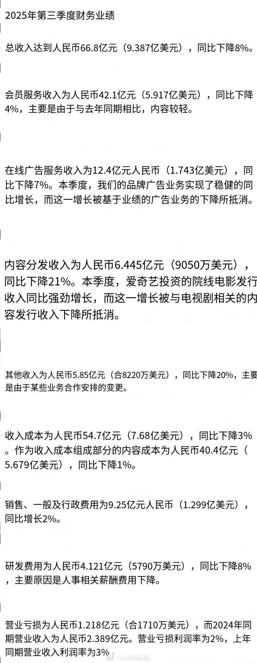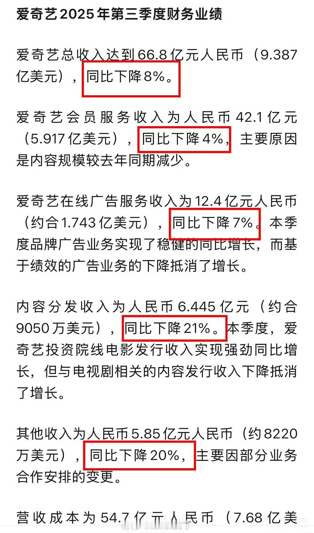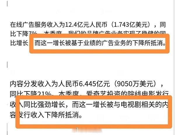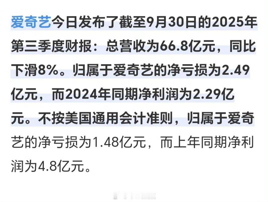 爱奇艺CEO称业内开机率暴减🥝第三季度亏出新高度~亏出2.49亿,比第二季度的亏损率增加了1.86倍 爱奇艺第三季度电视剧板块亏损实锤了…不是两个破万剧吗?不仅没挣到钱,竟然还亏了。稀奇有点奇特,Q3🥝破万剧那么多怎么还亏了 🐧🥝互相上对方黑热搜!最大的赢家不会是裤吧?!
