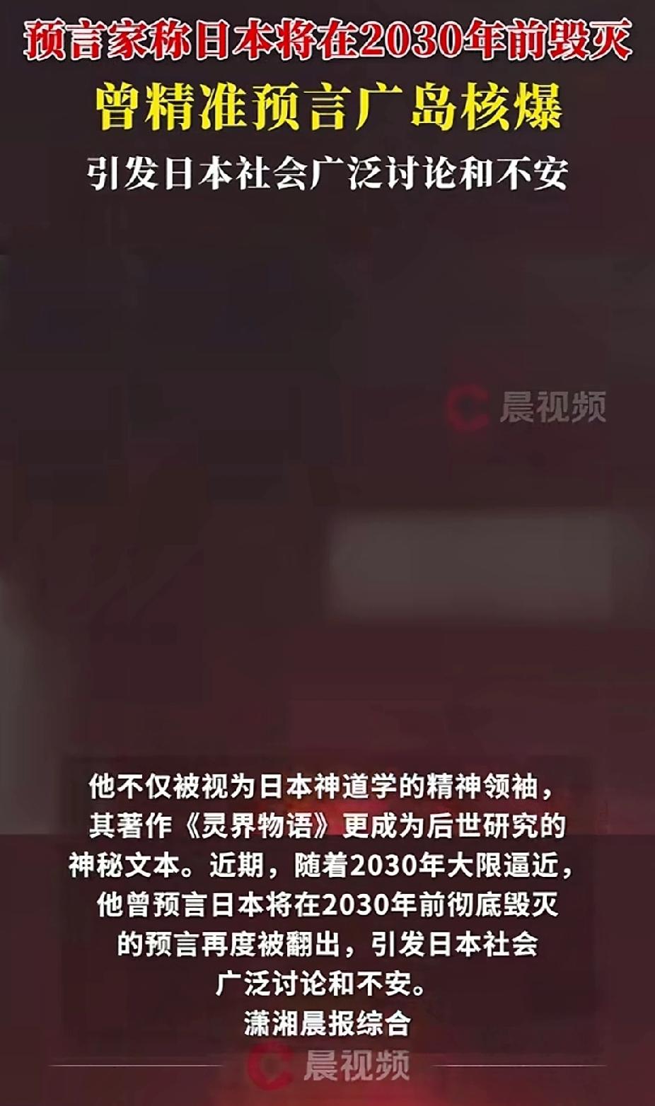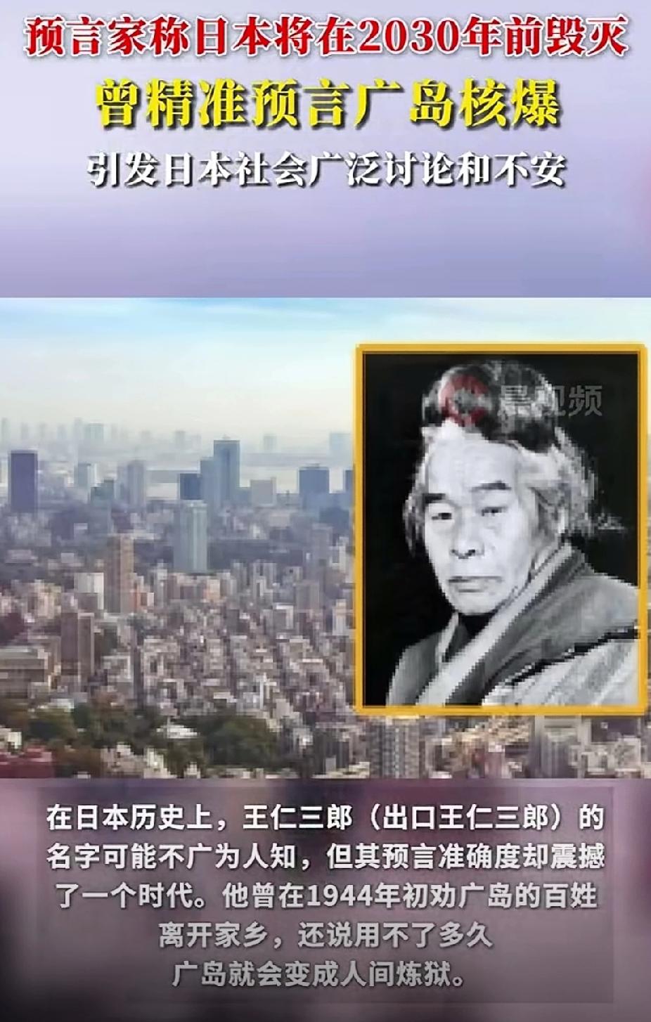 日本将在2030年前毁灭,这是日本神道学领袖王仁三郎的预言,他曾精准预中了广岛会变成人间炼狱,正是广岛预言的成真,这次“毁灭”预言闹的日本人心惶惶,甚至日本政府还跑到巴西购买土地,由于买的次数、面积过多,被巴西识破其狼子野心,断绝交易!多年来,日本人从来没有停止过对别的国家,尤其中国土地的觊觎,表面谦和,内心算计,可能是长期居住在危险环境里原因,人也变的神经兮兮,王仁三郎的预言更让日本人神经紧绷,等到2030年就好了,就不紧绷了!