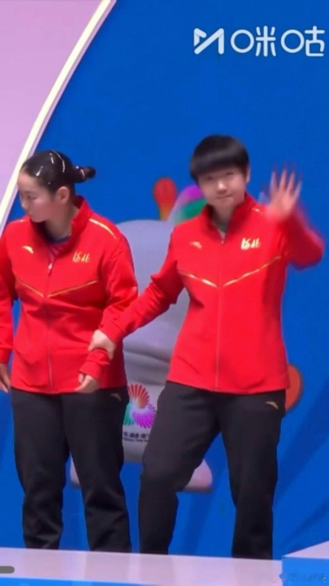 全运会女团颁奖仪式,孙颖莎拉着何卓佳上领奖台。