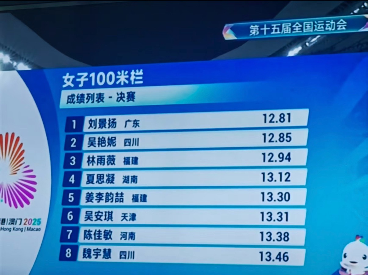 全运会田径女子100米栏决赛,刘景扬以12秒81夺冠,创造个人最好成绩🏅吴艳妮 12秒85创造赛季最好成绩获得银牌🥈林雨薇12秒94赛季最好成绩摘得铜牌🥉夏思凝13秒12第四