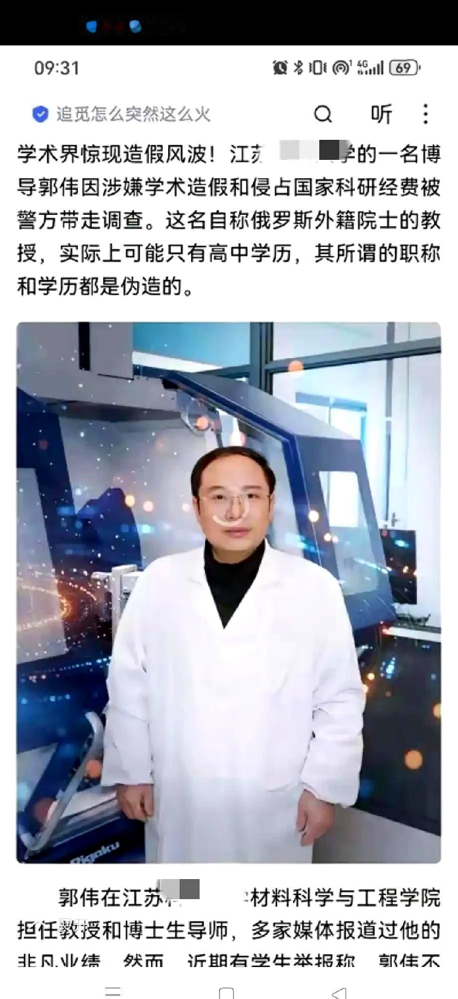 郭某被江苏科技大学以“海外顶尖人才”引进,两年内头衔加身,履历“逆天”。 实际仅高中学历,骗取科研经费,现被立案调查。 奇怪啊,这发表多少SCI论文都是可查的,怎么造假? 几个所谓的海外院士身份也是可以查的吧? 那几个海外机构是不是水货也可以了解吧? 这么牛的海归顶尖人才可能正是江苏科技大学急需引进的门面型科研带头人,大学领导们的重视程度那是相当的高,那家伙又是安排当博导,又为他申领大额的国家科研经费,还为他申报中科院院士,真难为大学的领导们了,你们太辛苦了! 我辈岂是蓬蒿人啊!学历不代表能力。楷模! 它自身水平应该至少提升到硕士研究生程度了吧? 不然两年内怎么带研究生? 他是重名才被发现,之前没人怀疑他学术水平。