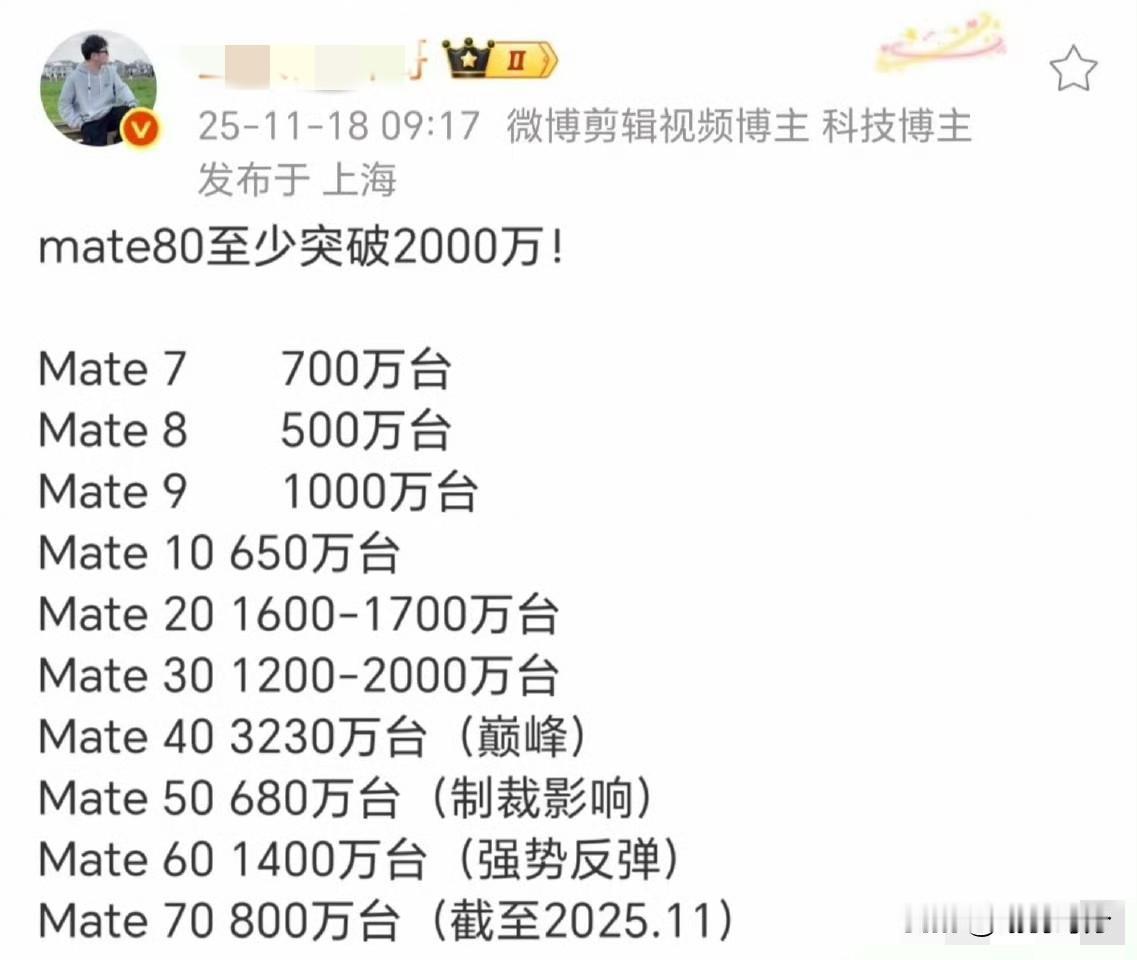 有人预测,mate80系列销量至少会达到2000万台。 从华为Mate 7系列开始,Mate系列销量一直在稳步提升,直至Mate 40系列达到顶峰,销量超过3200万台。 Mate 50因使用高通处理器,且该处理器属于当时的上代产品,销量出现大幅下滑。 每次麒麟芯片回归,都激发了大家支持华为的热情,Mate 60、Mate 70销量均超过1000万台。 如今Mate 80携圆环设计再度回归,同时国产最强芯片也即将推出,华为Mate 80系列销量有望再创巅峰。 mate80 mate 80