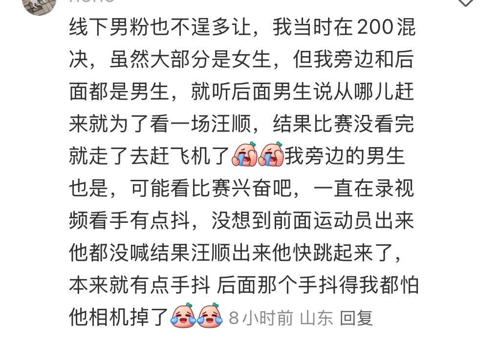 看完汪顺立马走,汪顺出现之前都很安静,汪顺一出场就要跳起来…这点男粉女粉都一样。