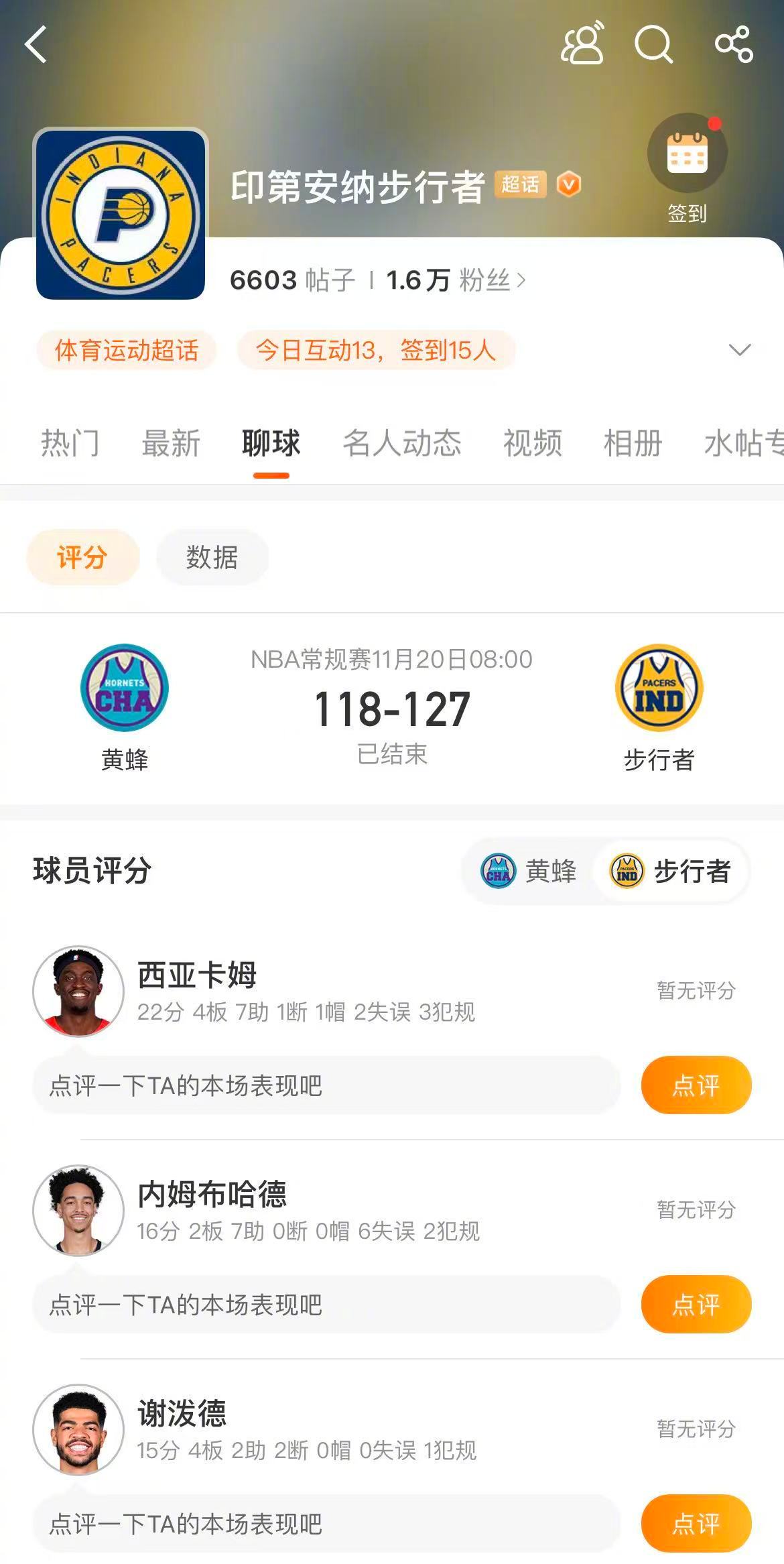 连败终于终结了!步行者127-118战胜黄蜂,终结八连败!马瑟林24分12篮板,西亚卡姆22分,内姆哈德16分。黄蜂方面,克努佩尔28分,布里奇斯25分。可进入 和 为比赛的球员进行打分吧!