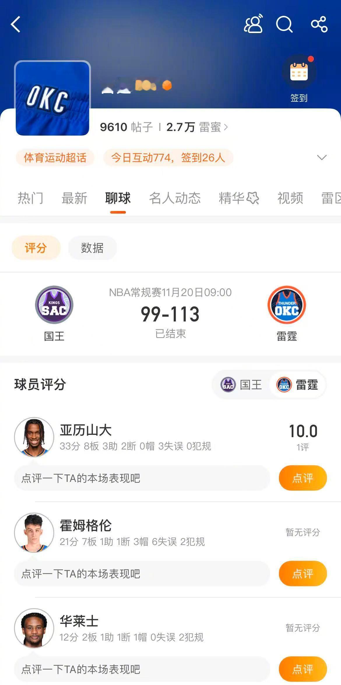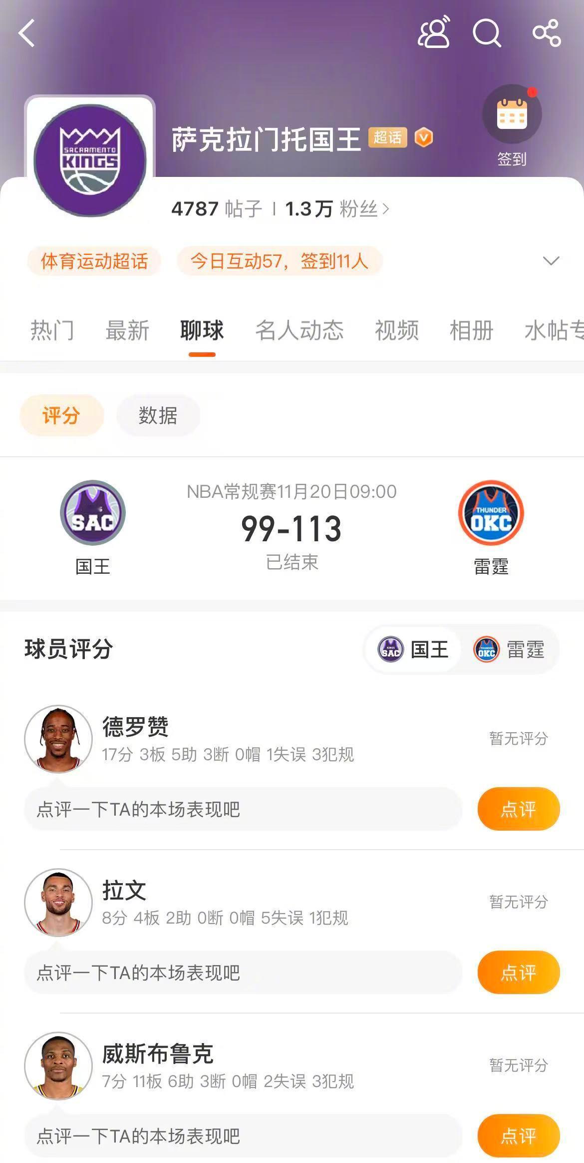 继续前进!雷霆113-99战胜国王,豪取7连胜。亚历山大 稳定发挥,得到33分8篮板,霍姆格伦 21分7篮板,多尔特14分。国王方面,施罗德21分,德罗赞17分,威少 7分。进入 和 对球员的表现进行打分吧!