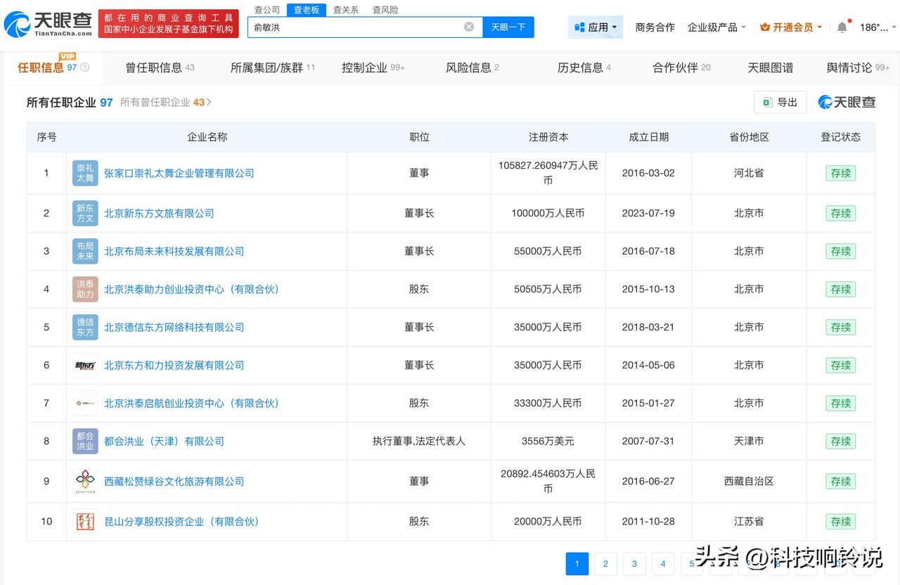 【俞敏洪名下关联近70家存续企业 俞敏洪商业版图揭秘】俞敏洪说鼓励员工吐槽 11月16日,新东方成立32周年之际,创始人俞敏洪从南极向全体员工发送内部信。有员工表示无法与正在旅游的老板共情。11月20日,俞敏洪发文回应此前在南极发布全员信被吐槽,称鼓励员工吐槽。 天眼查App显示,俞敏洪名下关联近百家企业,其中近70家为存续状态,包括北京新东方文旅有限公司、北京布局未来科技发展有限公司、北京洪泰助力创业投资中心(有限合伙)等,涉及教育、文旅、科技、企业管理等领域,俞敏洪在上述企业担任董事长、董事等职务。 天眼查信息:-c2345084071