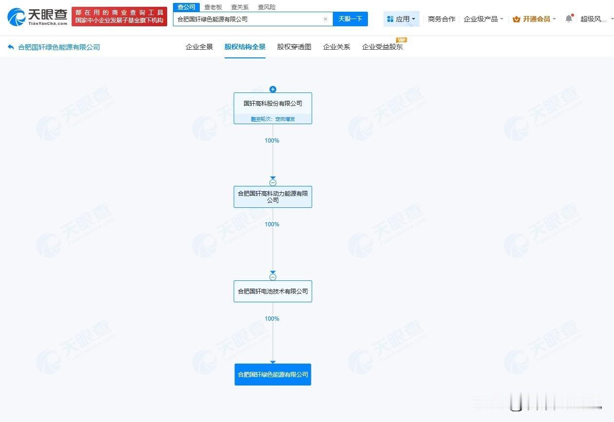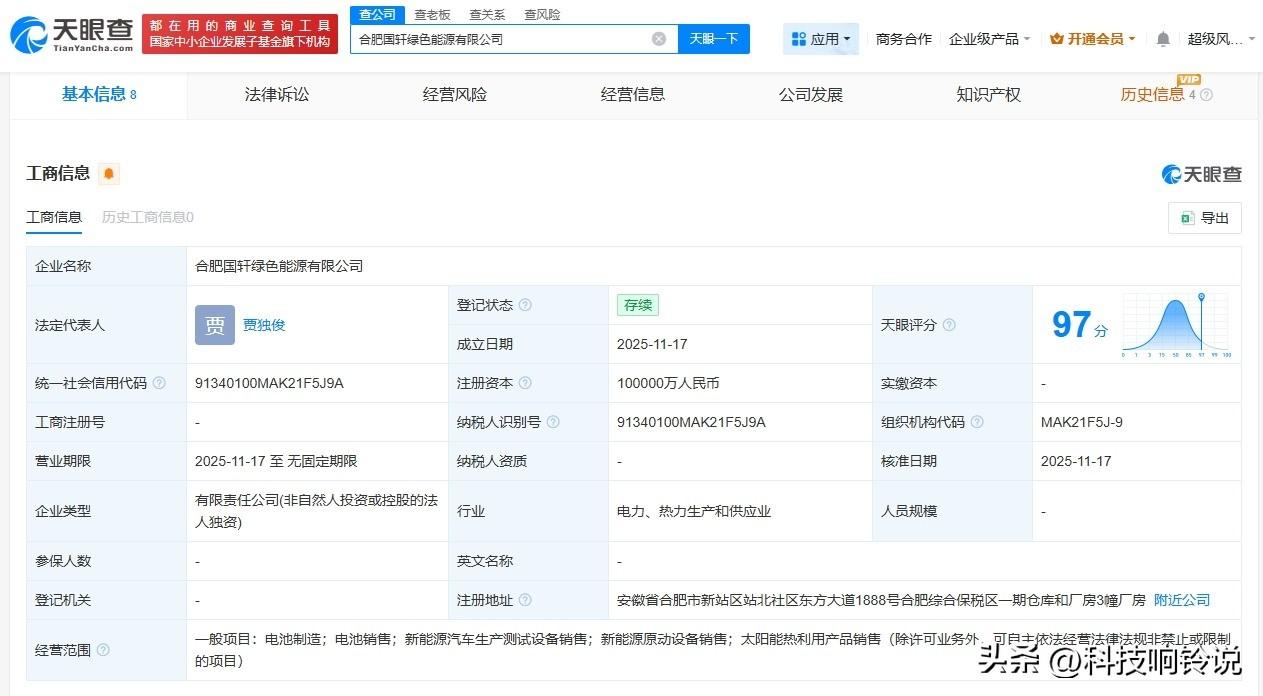 【国轩高科10亿成立绿色能源公司】 天眼查App显示,近日,合肥国轩绿色能源有限公司成立,法定代表人为贾独俊,注册资本10亿人民币,经营范围包括电池制造、电池销售、新能源汽车生产测试设备销售等。股权全景穿透图显示,该公司由国轩高科(002074)旗下合肥国轩电池技术有限公司全资持股。 天眼查信息: