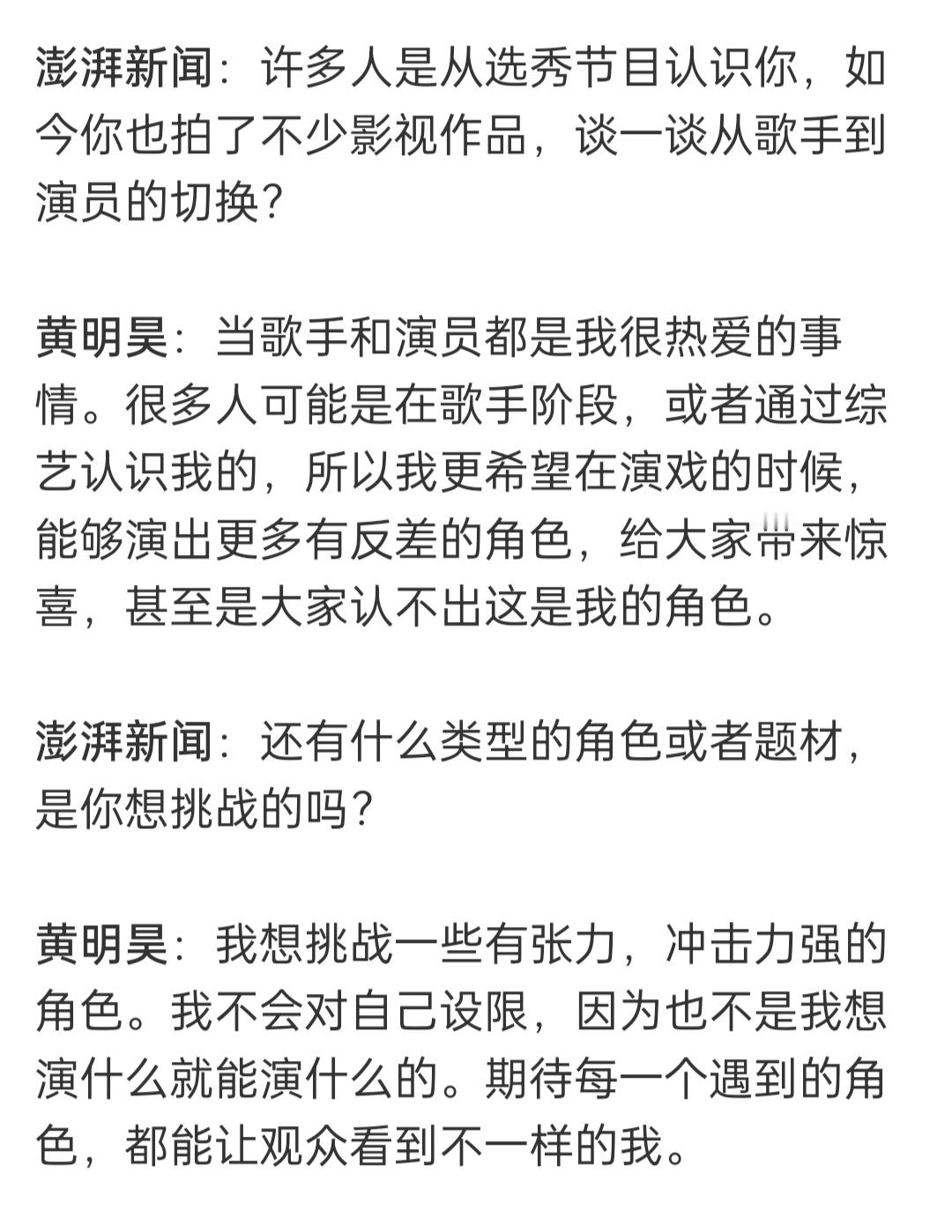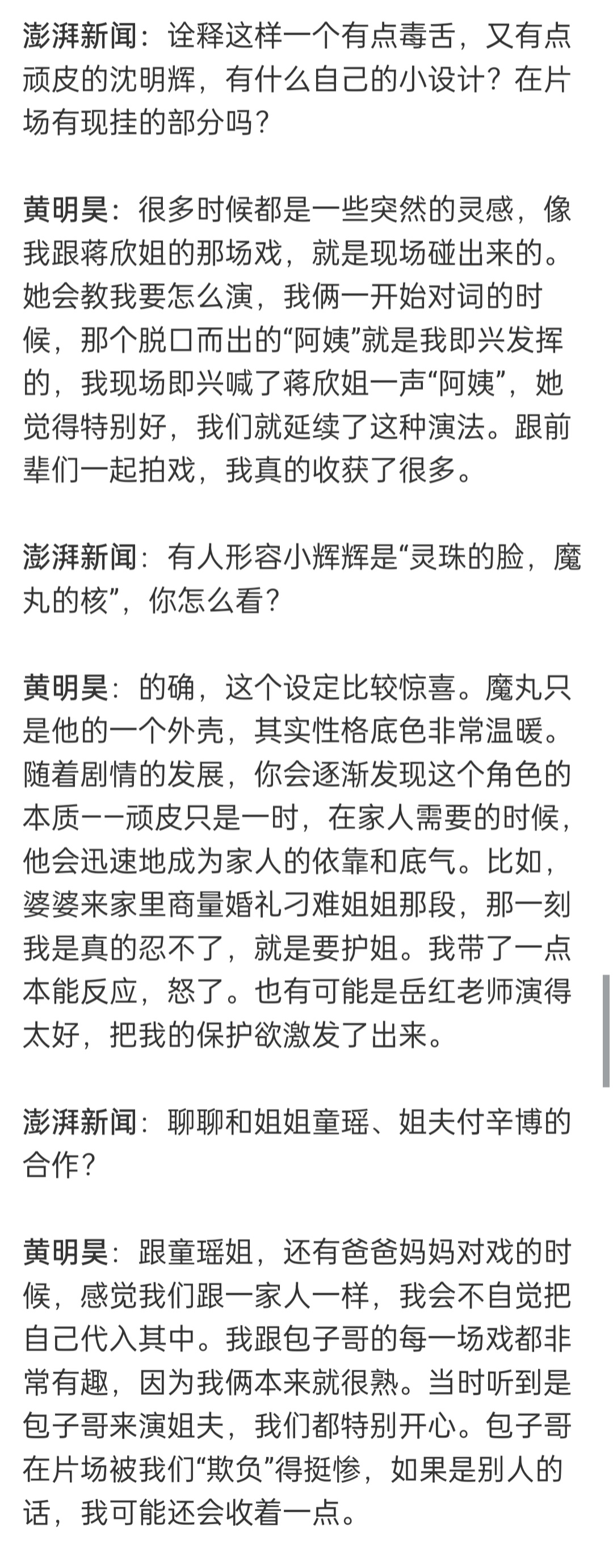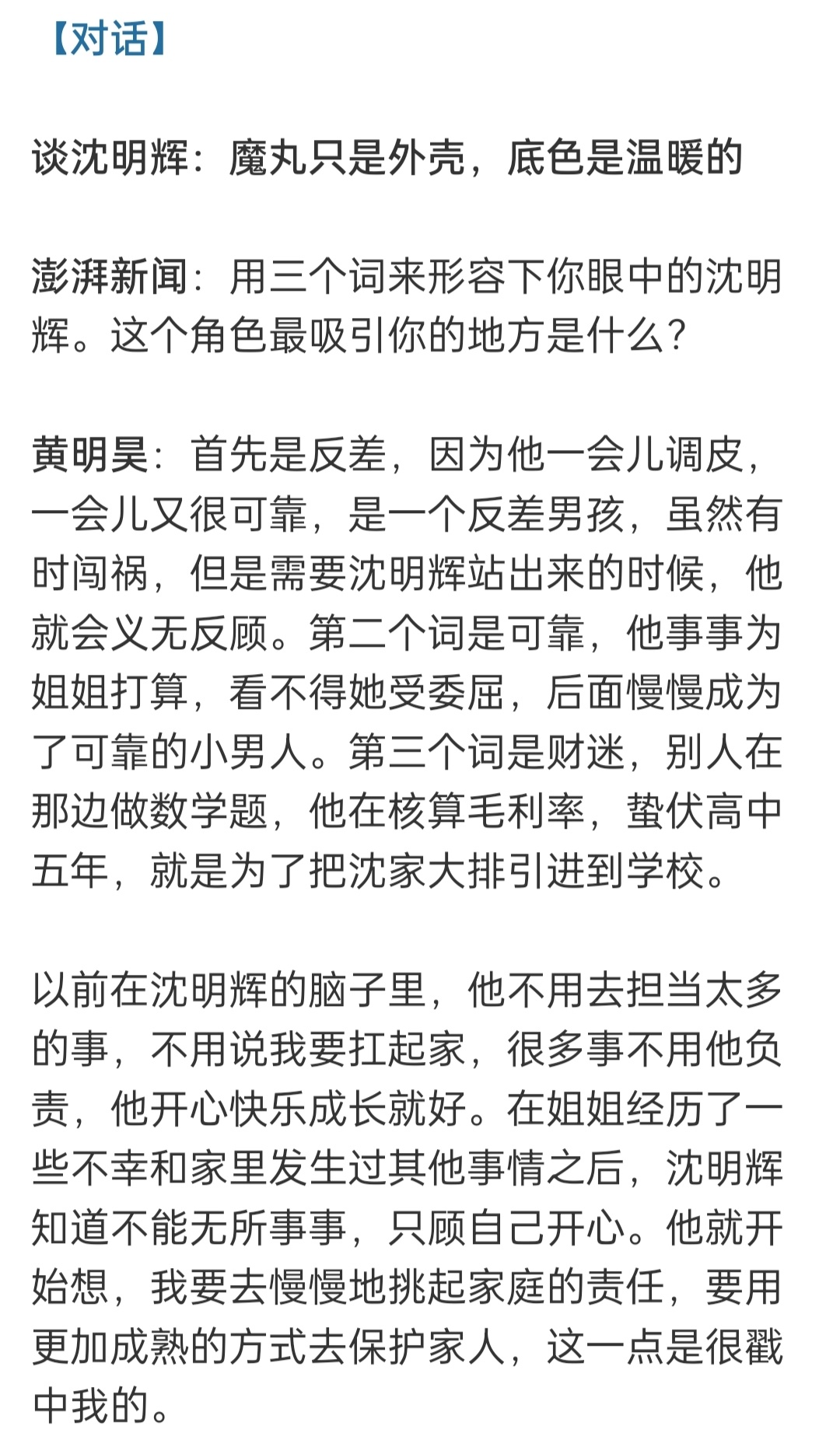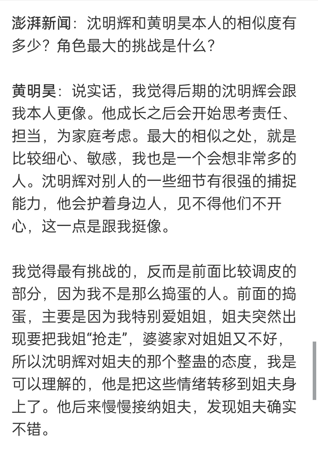 黄明昊《四喜》澎湃新闻文字专访🈶谈沈明辉“魔丸可能只是一个外壳,他的性格底色还是非常温暖的,他对于家人的爱,促使他成长,这是他很闪光的部分。”自己和他最大的相似之处是:“细心、敏感”用三个词来形容沈明辉:反差 可靠 财迷当歌手和演员都是很热爱的事情。想挑战一些有张力,冲击力强的角色,不会对自己设限。cr:澎湃新闻