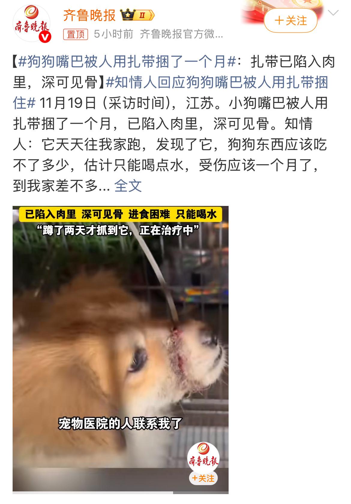 看到那条小狗的遭遇,我的心一下子揪紧了。就在前几天,江苏有一只小狗,它的嘴巴被人用扎带死死捆住,整整捆了一个月。当它被人发现时,那根扎带已经深深陷进肉里,伤口深得都能看见骨头。光是想象一下那个画面,就让人心疼得喘不过气来——这一个月里,它该有多疼,多害怕,连一口饭都吃不了,一口水都喝不下。 这种残忍的行为,真的远远超出了正常人能理解的范围。你可以不喜欢小狗,但凭什么这样折磨一个不会说话的生命?这已经不是简单的讨厌动物,而是一种骨子里的残忍。今天能对一只小狗下这种狠手,谁能保证他明天不会把这种暴力转向身边的人?那些研究社会现象的人也指出,虐待动物和行为人的暴力倾向之间,往往存在联系。 更让人无力的是,虽然大家看了新闻都特别气愤,但很多时候,我们除了道德上谴责一下,好像拿这种行为没什么太好的办法。因为我们国家到现在还没有一部专门的法律来严惩虐待动物的行为。这就导致了一些人觉得“反正也不犯法”,做起坏事来有恃无恐。之前不光有这种用扎带捆嘴的,还有用开水活活烫死狗狗的,还有人在宠物寄养机构疏于照料甚至疑似虐待宠物,或者当街摔狗的。每一起这样的事发生,都在拷问着我们:对待那些弱小的、无法为自己发声的生命,我们的社会底线到底在哪里? 其实,善待动物,恰恰衡量着一个社会的文明程度。看看那些做得好的国家,它们很早就有严格的法律规定,虐待动物会面临严厉的惩罚。我们也应该加快脚步了。是时候用明确的法律,给那些残忍的行为划出一条“绝对不可以”的红线。同时,我们也得从自己做起,学会尊重生命。如果不爱,也请千万别伤害。养了宠物就要负责一辈子,不能随意抛弃;看到小动物受罪,在确保自身安全的情况下,能帮一把就帮一把。我们每个人的一点点善意,汇聚起来可能就是能照亮它们整个生命的光。 对于这条受苦的小狗,我们期盼它能遇到好心人,得到专业的救治,慢慢恢复健康,忘记这段可怕的经历。而对于我们每一个人,是否也应该想一想,自己能为阻止下一起类似的悲剧做点什么?你是否也曾目睹或听说过身边虐待动物的事情?你觉得我们应该如何更好地保护这些不会说话的生命?欢迎在评论区分享你的看法。