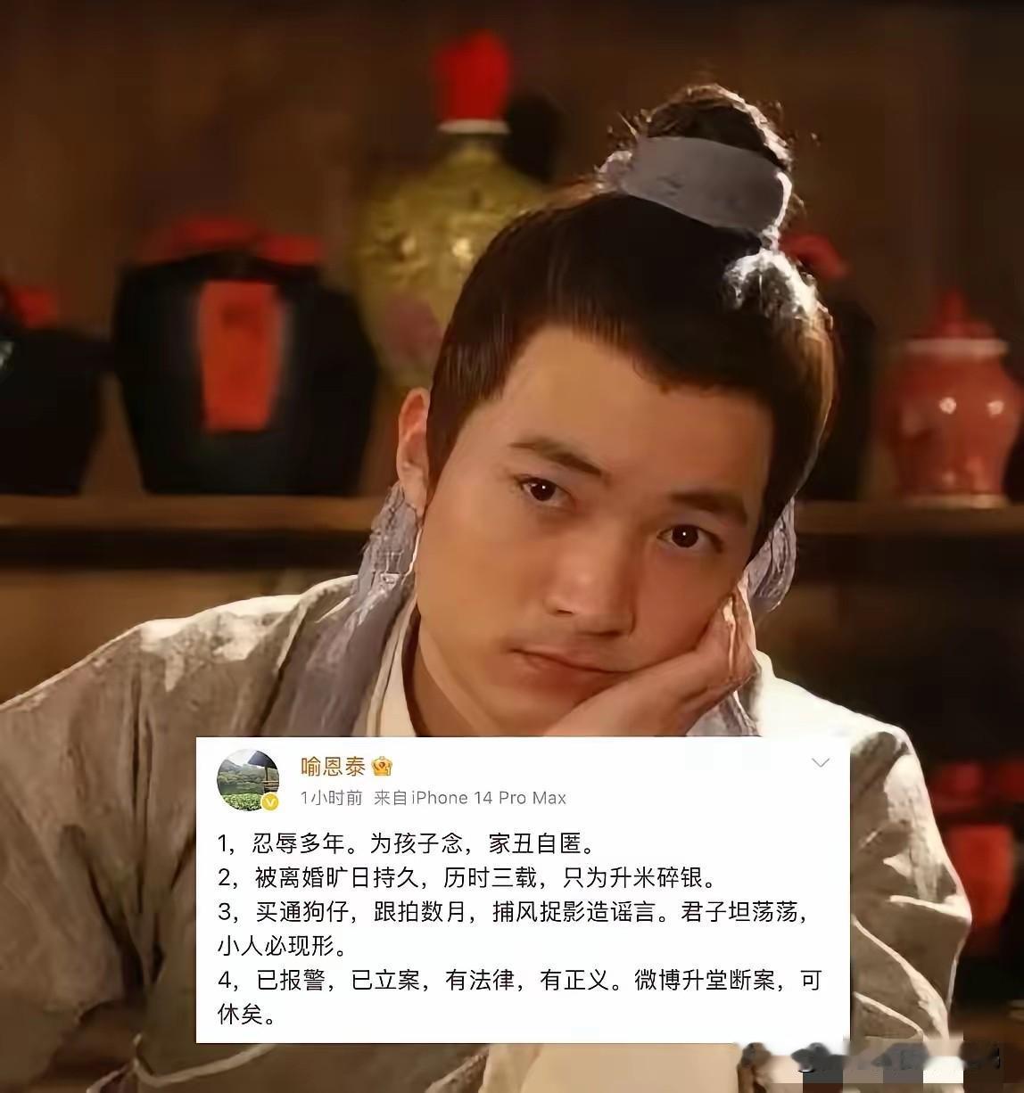 喻恩泰再次证明了, 读书真的有用, “读书使人先进,明理而通达”这是喻恩泰在社交平台发文中展现出来的气度。 面对恶意造谣四句话说的简洁有力,又恰到好处:“为了孩子忍辱负重”、“离婚已经旷日持久”、“我没有做过任何攻击性的言辞”、“你们没有良知,良心让你们忏悔”无奈中透着坚定,没有丝毫攻击性言辞,却让造谣者无地自容,这样回应被称为“教科书级”也不为过。 也是网友说的“文化人的优雅反击”!读书真的可以改变一个人的气度和境界,能从容不迫,智勇双全,优雅地化解各种危机和挑战,这就是读书的力量! 麻烦看官老爷们右上角点击一下“关注”,既方便您进行讨论和分享,又能给您带来不一样的参与感,感谢您的支持!