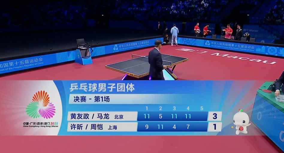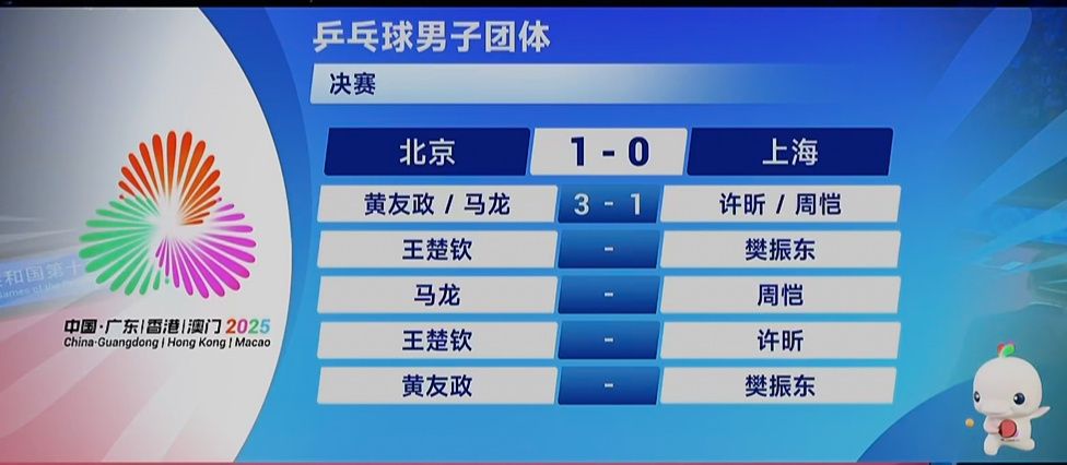 马龙、黄友政3-1许昕、周恺,北京队大比分1-0领先上海队