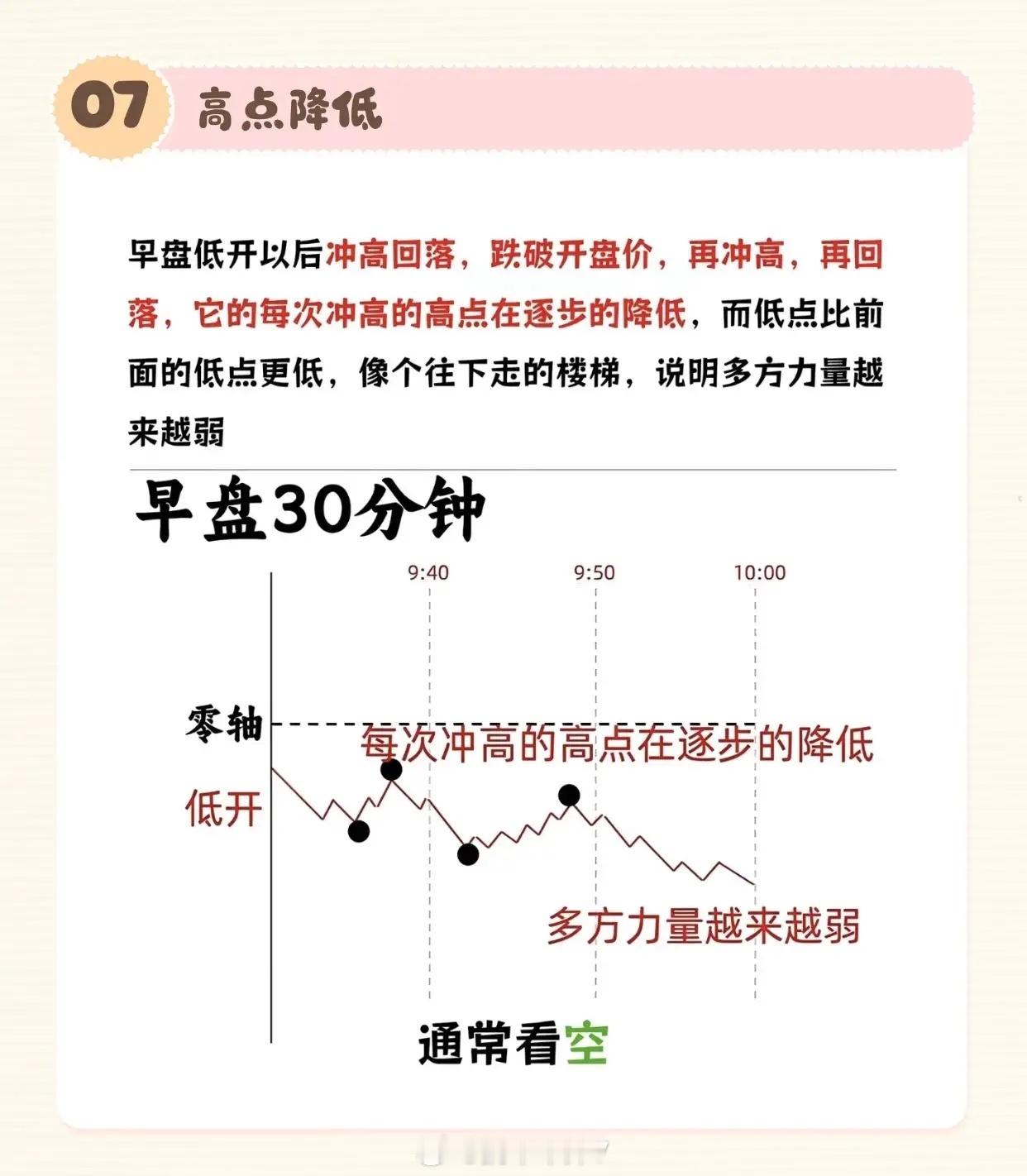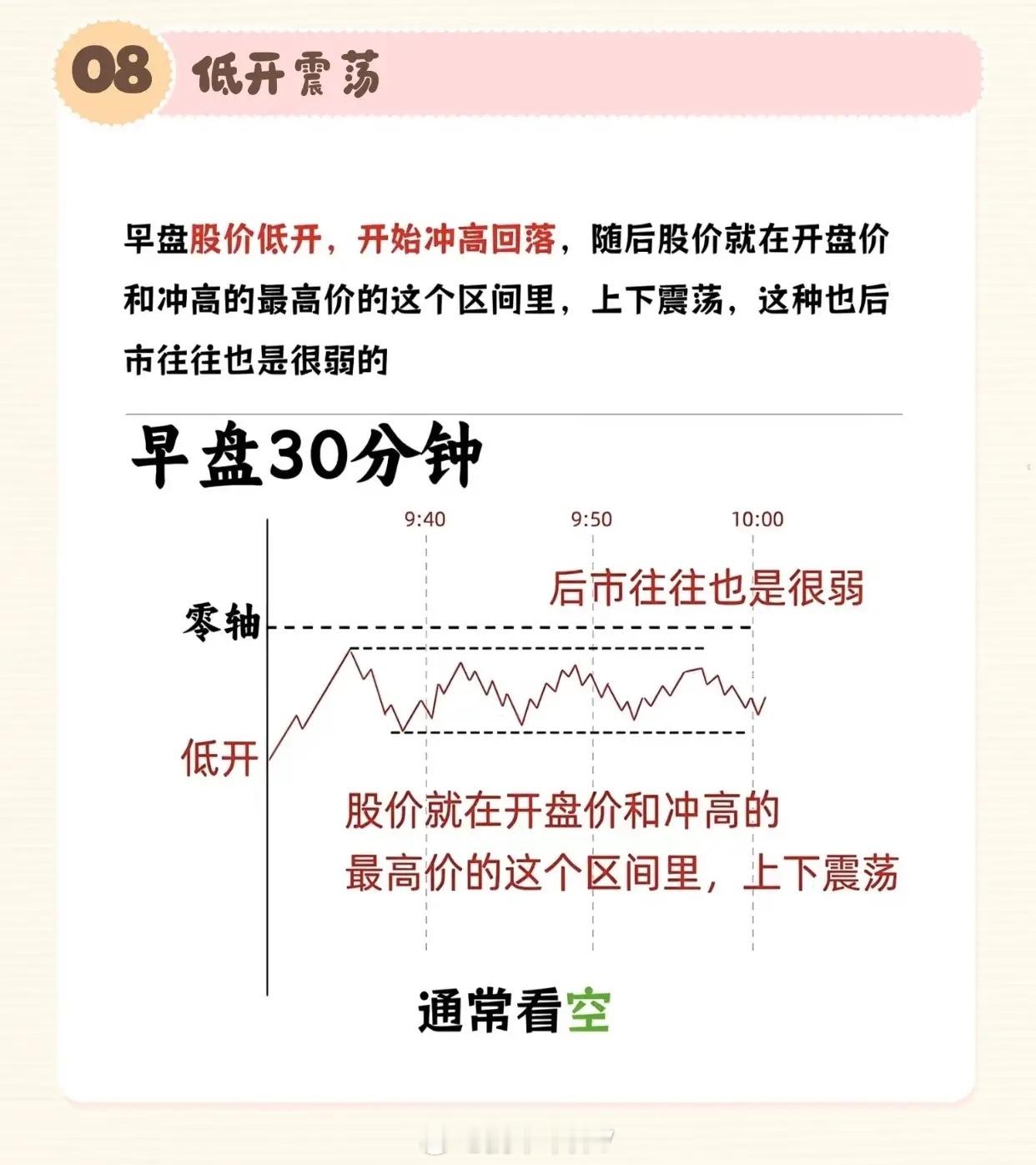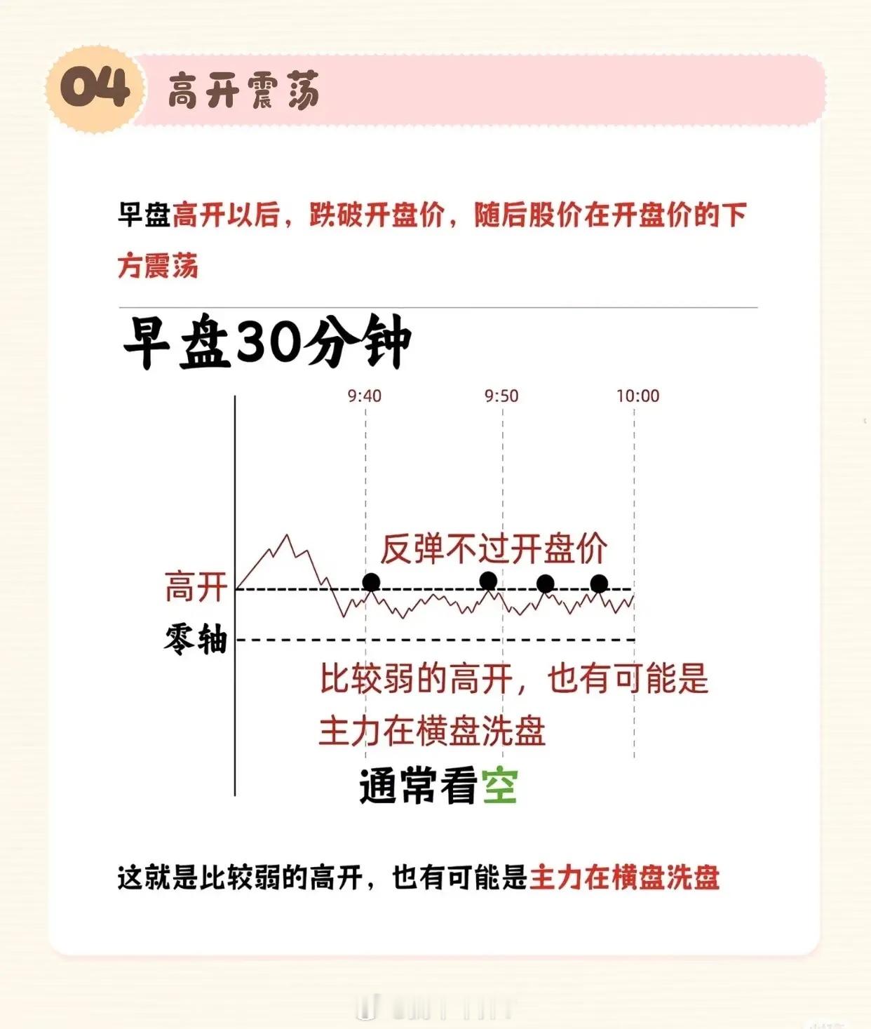 早盘30分钟经典分时走势的总结:1. 01 高开最强走势:高开2个点以上,冲高回调不破开盘价,再冲高突破前高,半小时或涨停,强势;若高位不封板,可能诱多。2. 02 高开回踩零轴:高开后冲高回落至零轴止跌,再放量上攻突破前高,次强走势,零轴为重要支撑,跌破则转弱。3. 03 高开低走:高开后快速冲高诱多,随后跌破开盘价和零轴一路下滑,典型主力出货,看空信号。4. 04 高开震荡:高开后跌破开盘价并在其下方震荡,反弹不过开盘价,偏弱,可能是洗盘,通常看空。5. 05 低开高走:低开后下探不破零轴止跌,再放量上攻突破前高,偏强走势,通常看多。6. 06 底部抬高:低开后震荡回升,虽未突破零轴但低点不断抬高,主力稳健,后市通常不差,偏多。7. 07 高点降低:低开后多次冲高但高点逐步下移,呈“下楼梯”状,多方乏力,看空信号。8. 08 低开震荡:低开后冲高回落,随后在开盘价与高点之间震荡,无明显方向,后市通常较弱,看空。 总体规律:- 高开 + 回调不破关键位(开盘价/零轴)+ 再突破 = 强势/看多- 高开/低开 + 跌破关键支撑 + 持续走低/震荡 = 弱势/看空- 关键位:开盘价、零轴(昨收价)、前高;放量突破多为积极信号,跌破支撑则警惕主力出货或转弱。