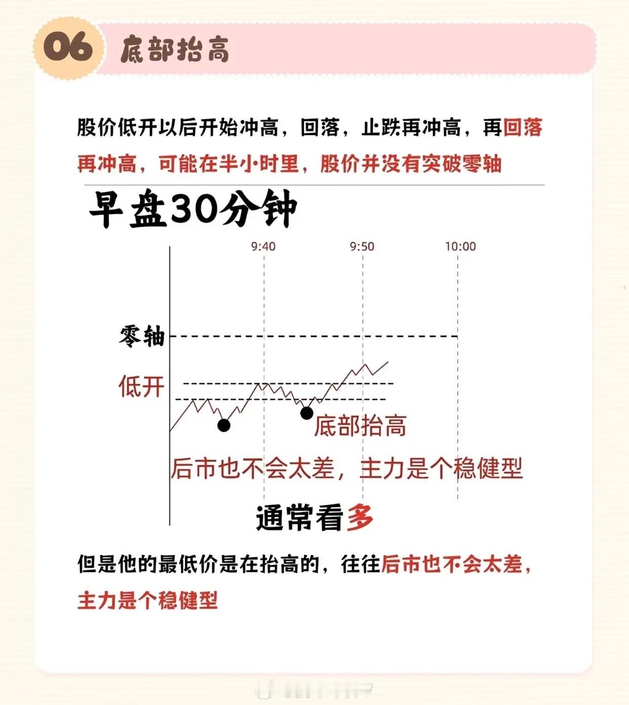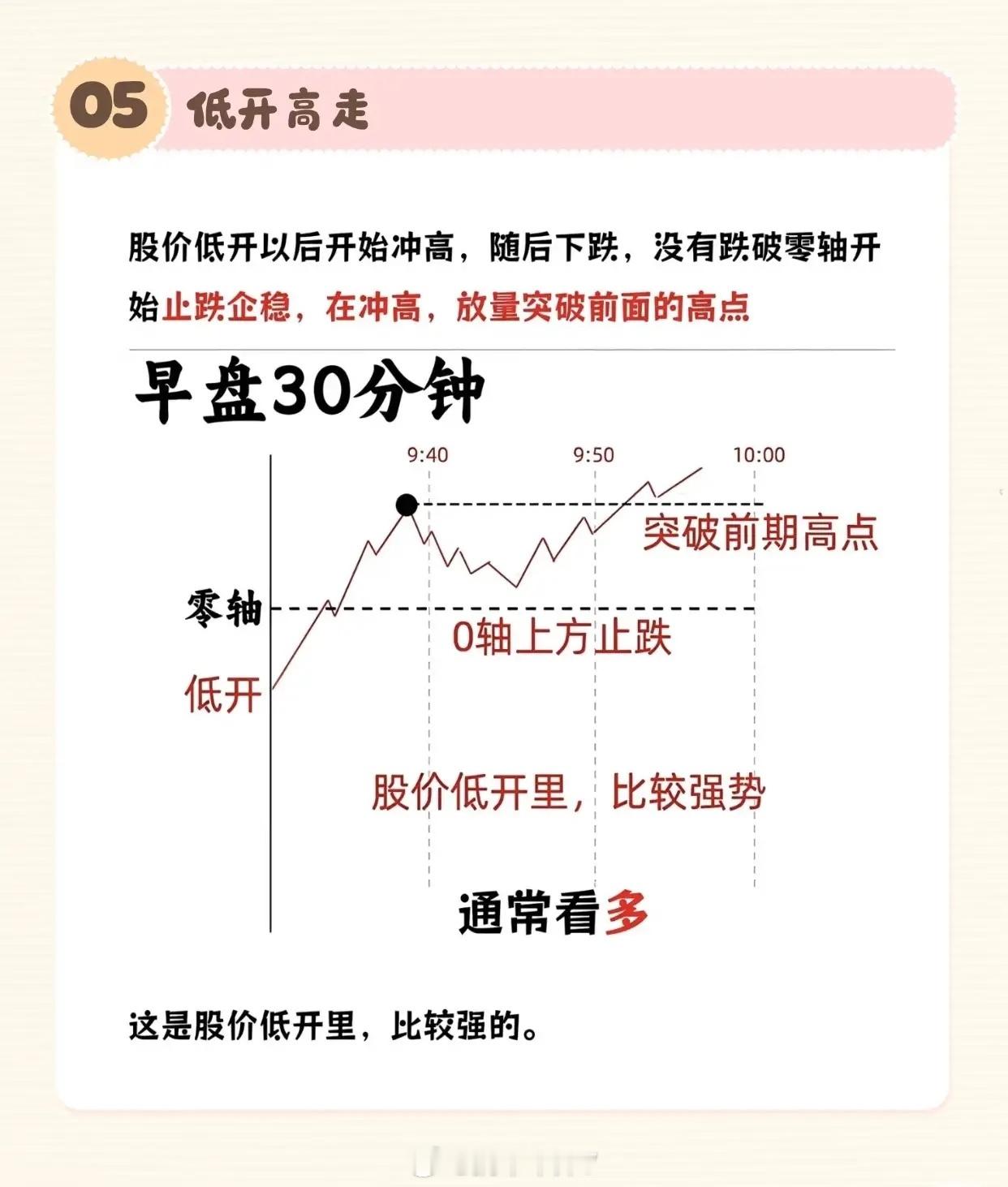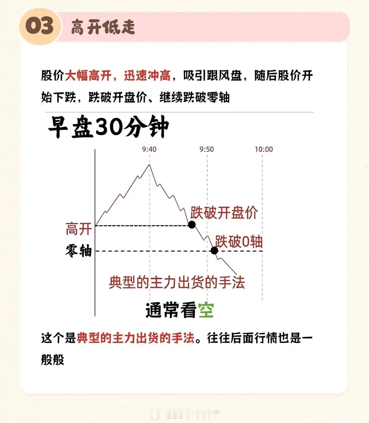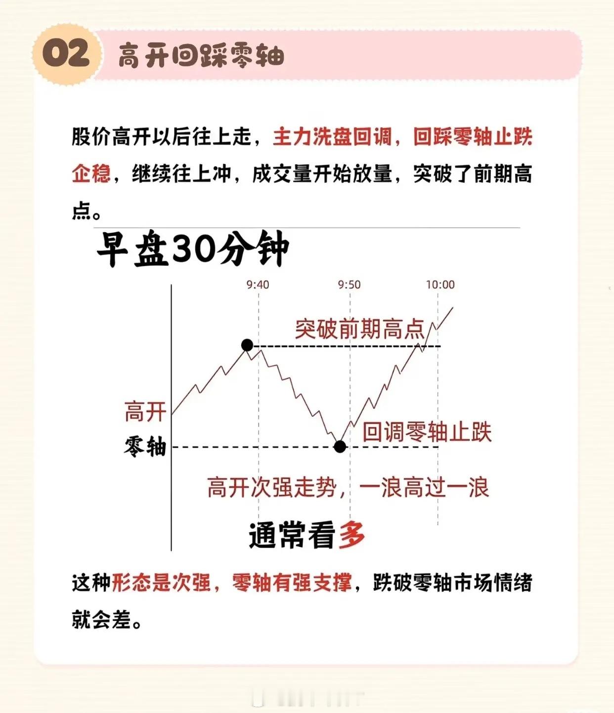 早盘30分钟经典分时走势的总结:1. 01 高开最强走势:高开2个点以上,冲高回调不破开盘价,再冲高突破前高,半小时或涨停,强势;若高位不封板,可能诱多。2. 02 高开回踩零轴:高开后冲高回落至零轴止跌,再放量上攻突破前高,次强走势,零轴为重要支撑,跌破则转弱。3. 03 高开低走:高开后快速冲高诱多,随后跌破开盘价和零轴一路下滑,典型主力出货,看空信号。4. 04 高开震荡:高开后跌破开盘价并在其下方震荡,反弹不过开盘价,偏弱,可能是洗盘,通常看空。5. 05 低开高走:低开后下探不破零轴止跌,再放量上攻突破前高,偏强走势,通常看多。6. 06 底部抬高:低开后震荡回升,虽未突破零轴但低点不断抬高,主力稳健,后市通常不差,偏多。7. 07 高点降低:低开后多次冲高但高点逐步下移,呈“下楼梯”状,多方乏力,看空信号。8. 08 低开震荡:低开后冲高回落,随后在开盘价与高点之间震荡,无明显方向,后市通常较弱,看空。 总体规律:- 高开 + 回调不破关键位(开盘价/零轴)+ 再突破 = 强势/看多- 高开/低开 + 跌破关键支撑 + 持续走低/震荡 = 弱势/看空- 关键位:开盘价、零轴(昨收价)、前高;放量突破多为积极信号,跌破支撑则警惕主力出货或转弱。