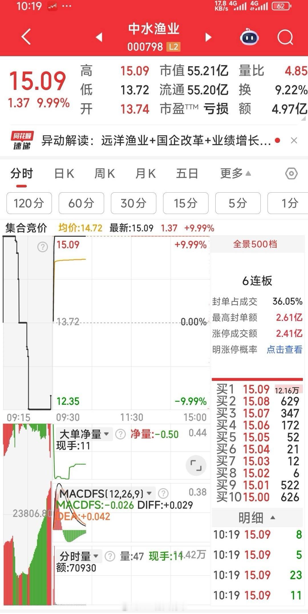 涨停15.09元出了中水渔业(因大单流出),8.7元又干了海南海药(因大单流入)