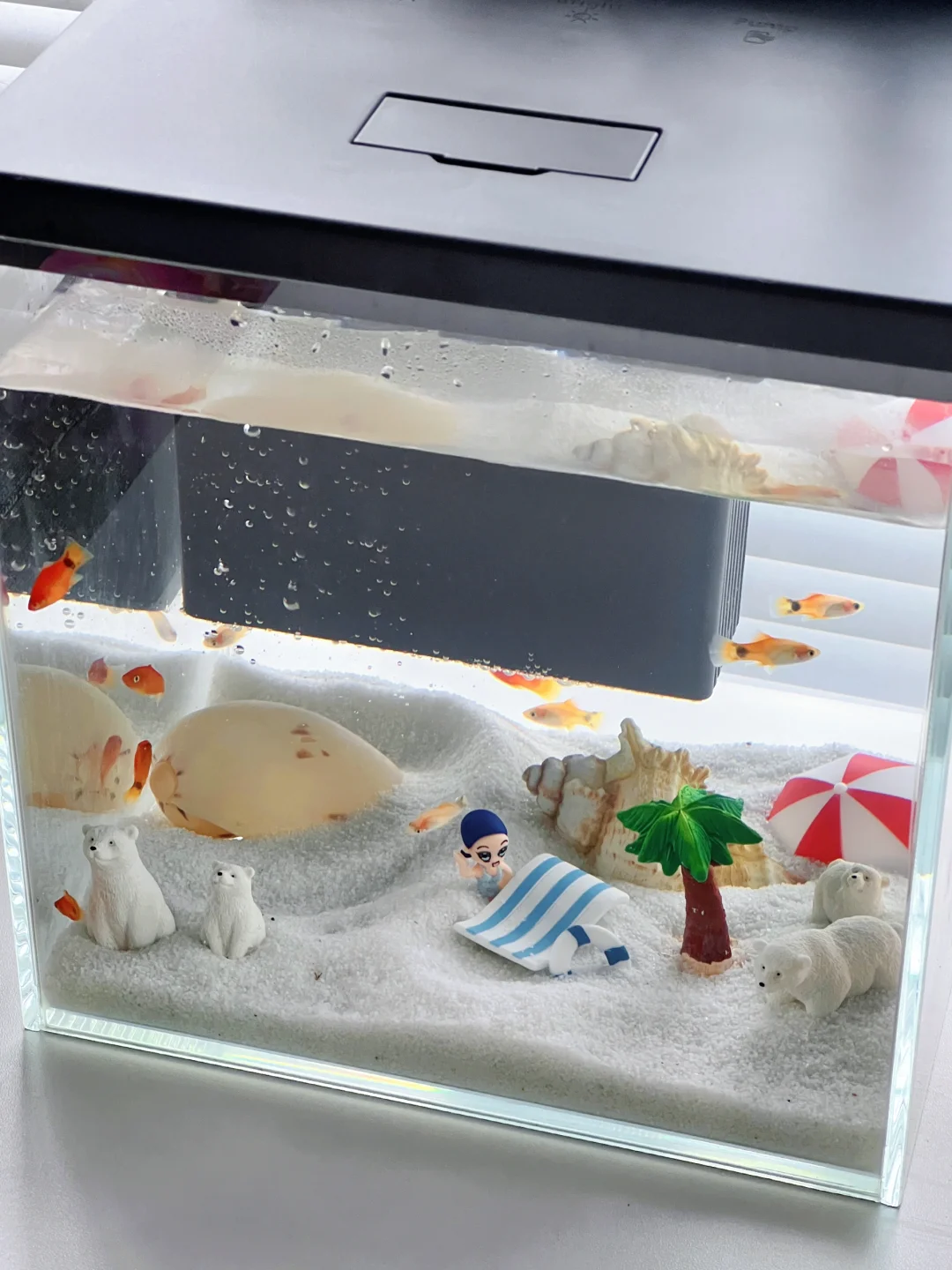 格林鱼缸自带无线感应水泵和多色彩led灯,对新手养鱼蛮友好。造景方面,我铺了一层白沙,几枚海螺,搭配北极熊椰树沙滩小物件,轻松自在适合夏天啦~清爽的feel.