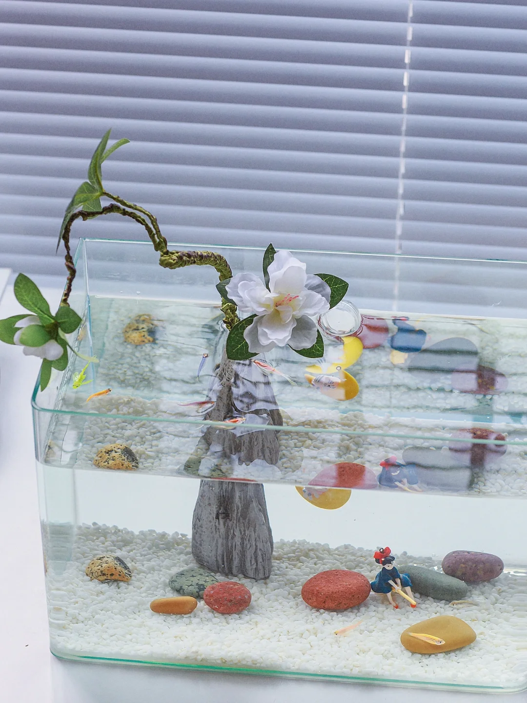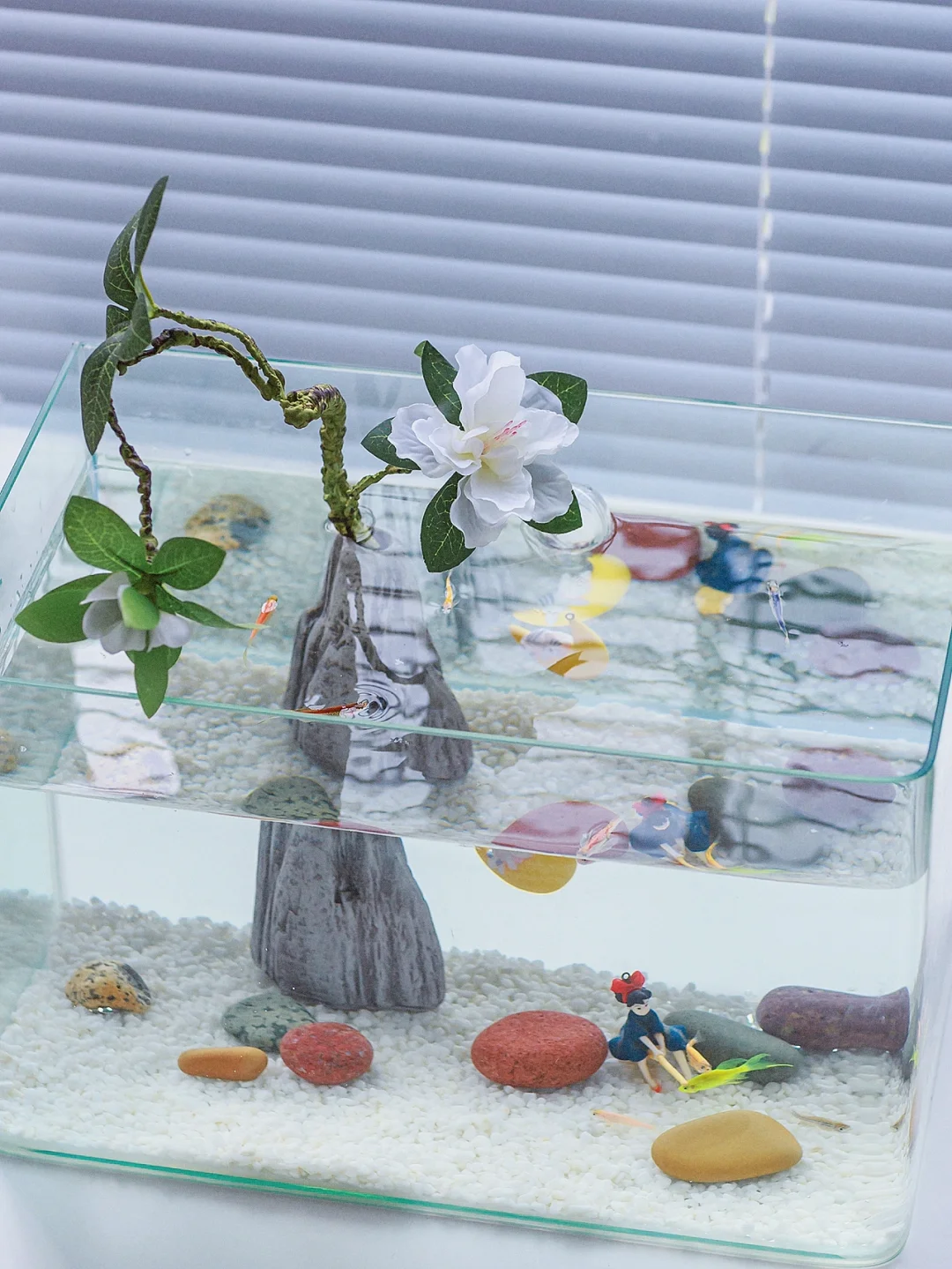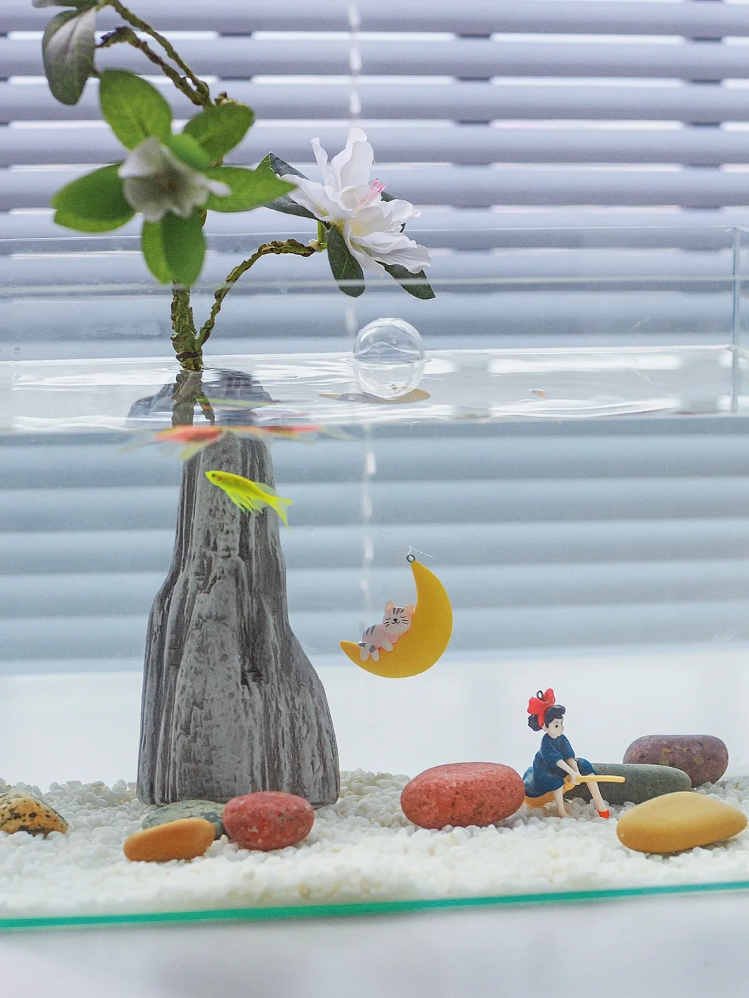 鱼缸布景还是简简单单,一层白色的底砂,几块长江石。新加入了一个造景假山石,可以插一些仿真花,或者鲜花水草根据自己喜好,我是插了一支仿真山茶花,模拟古色古香👀😆。一个漂浮月亮猫~一个魔法美少女。简单清爽。