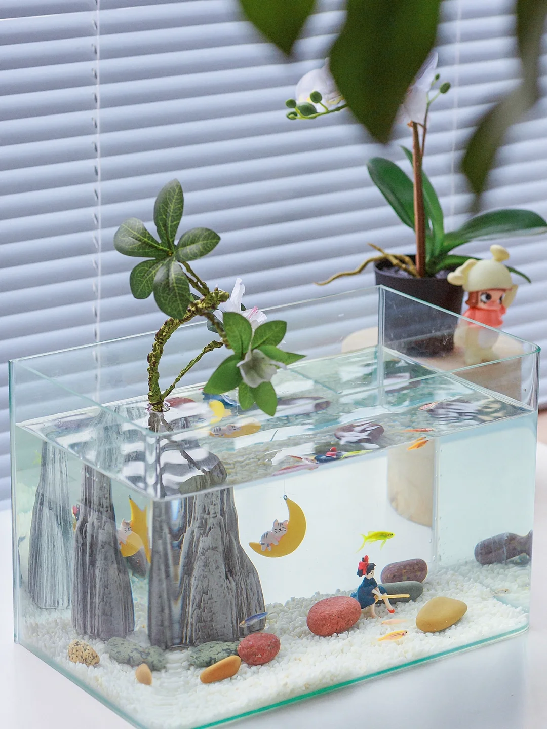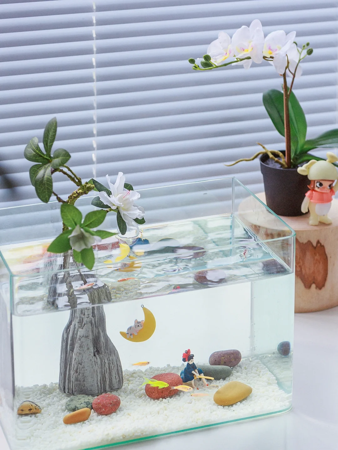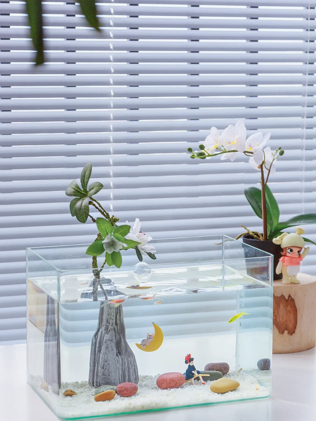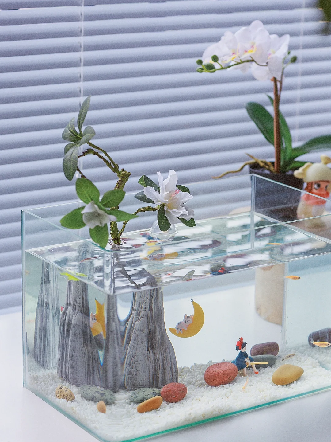 鱼缸布景还是简简单单,一层白色的底砂,几块长江石。新加入了一个造景假山石,可以插一些仿真花,或者鲜花水草根据自己喜好,我是插了一支仿真山茶花,模拟古色古香👀😆。一个漂浮月亮猫~一个魔法美少女。简单清爽。