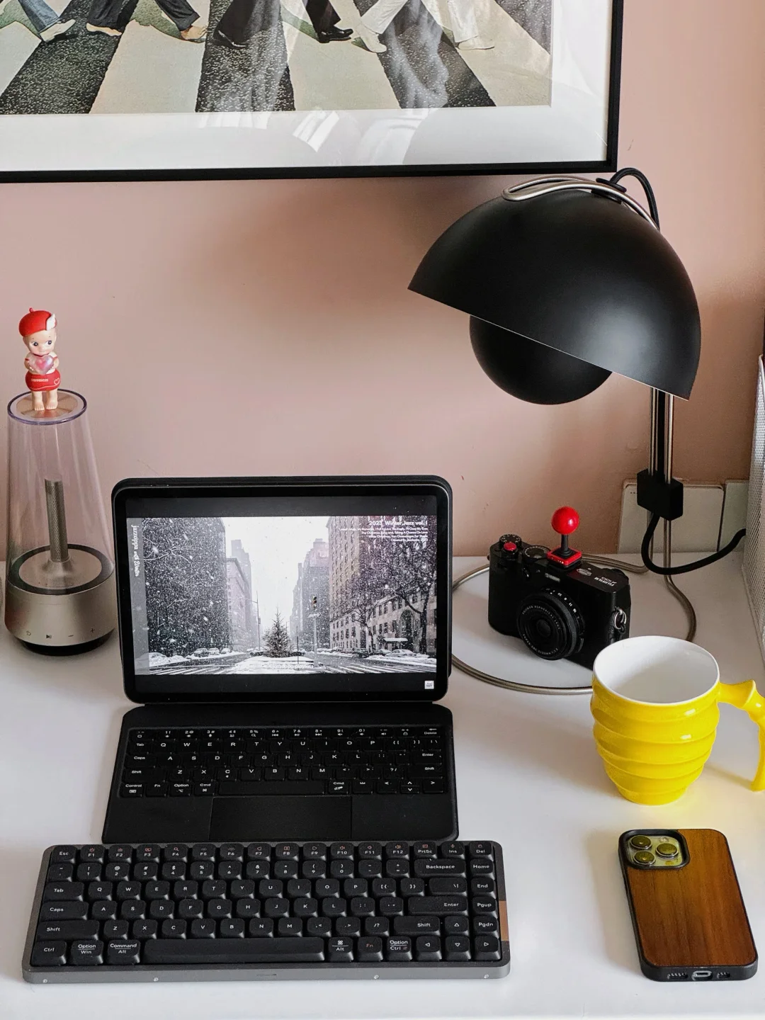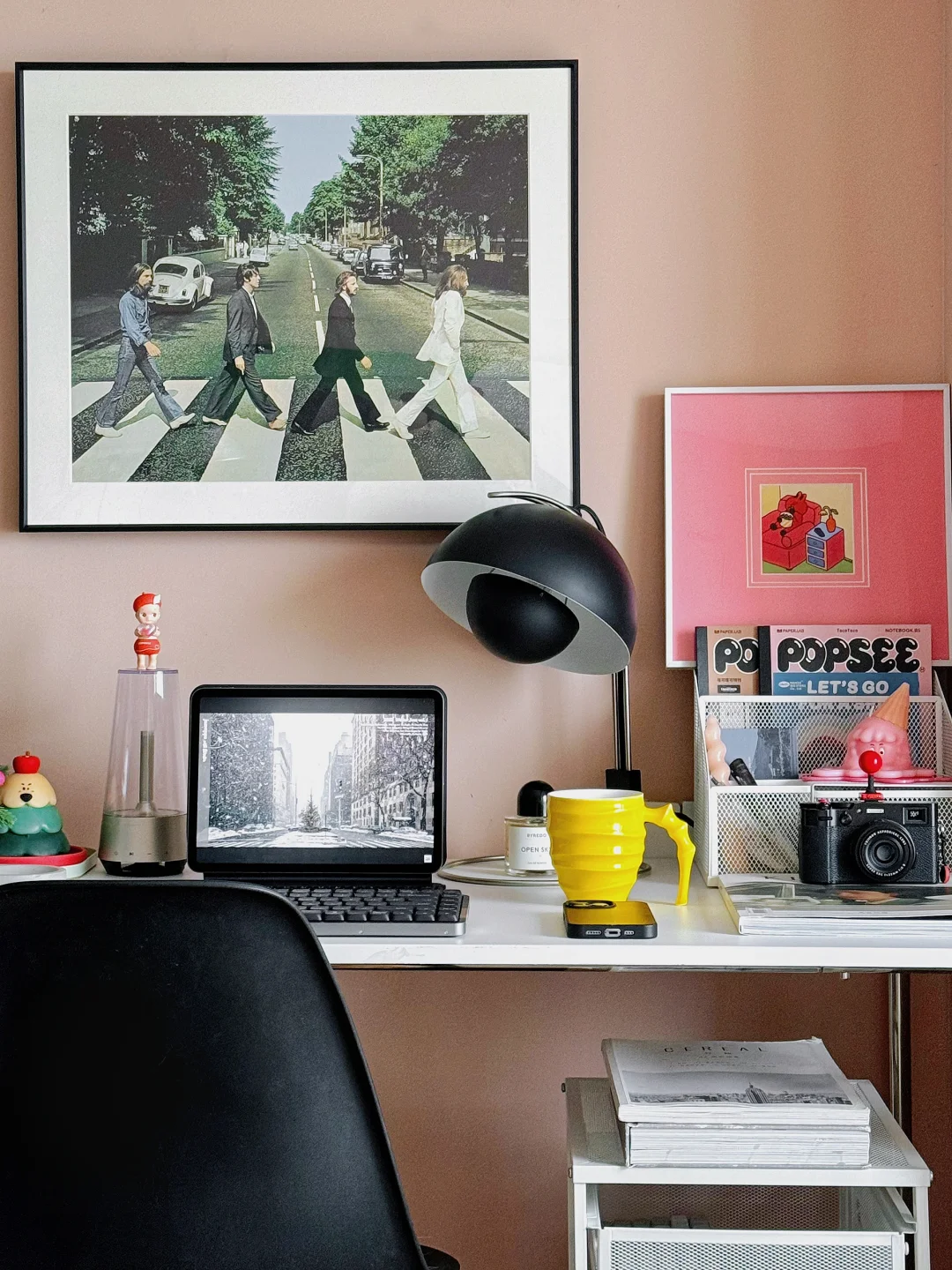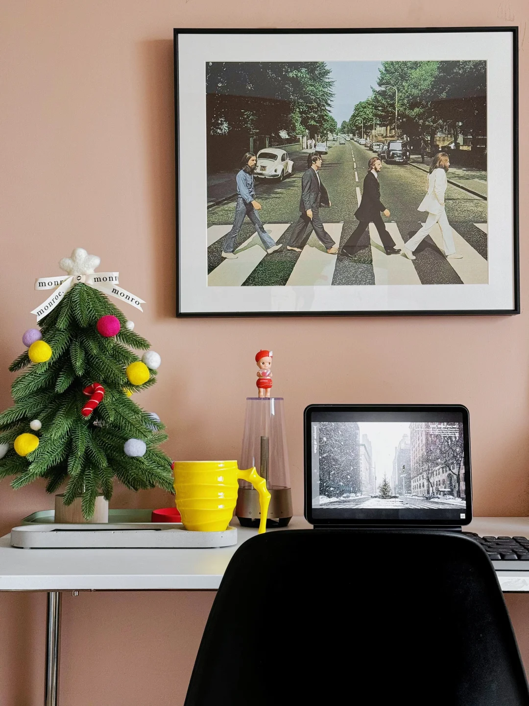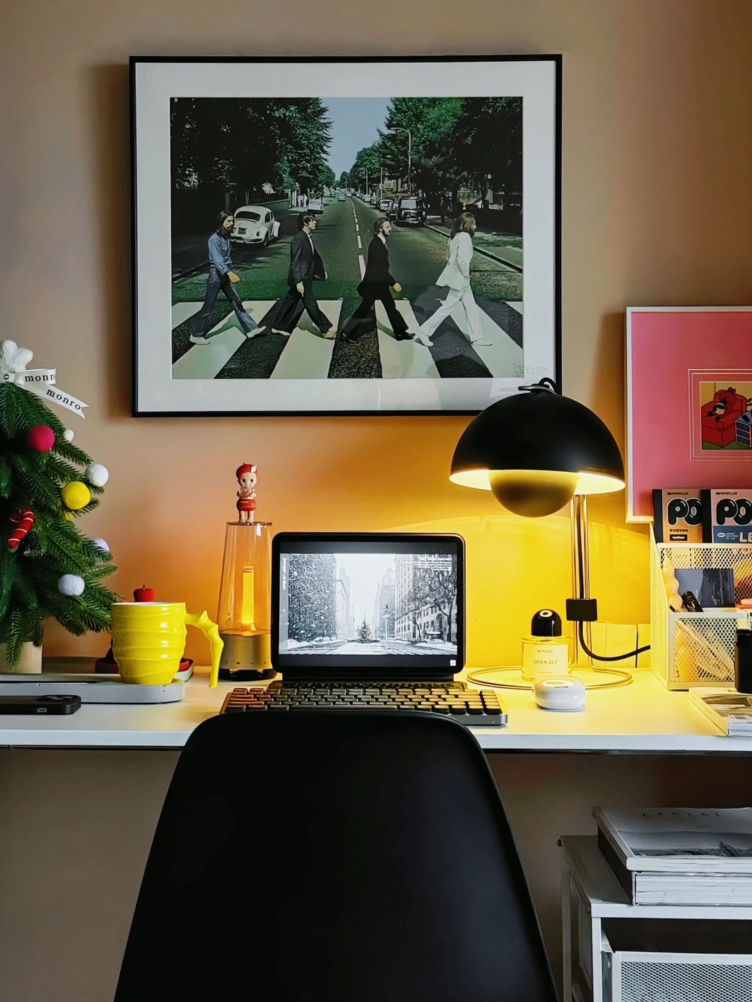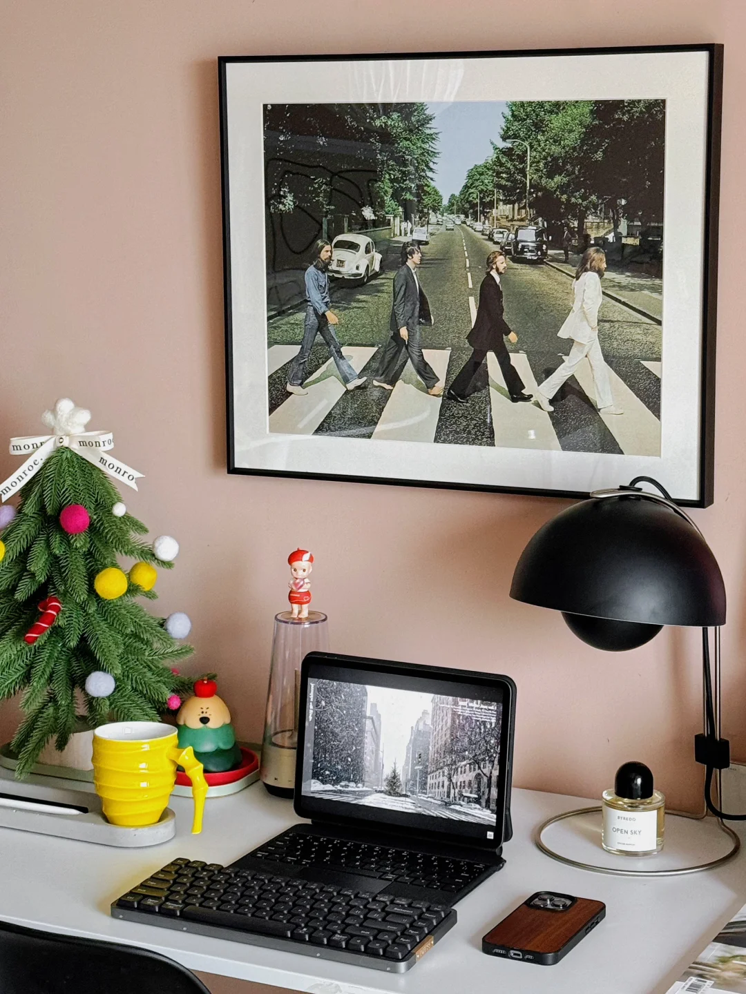 天冷了,呆在卧室时间长。 在卧室布置一个适合秋冬季的书桌吧。 莫兰迪色的墙面自带温暖 挂上一幅披头士经典款的装饰画 包豪斯风格台灯 ipadpro搭配黑色键盘 桌角摆上圣诞树🎄 点亮时 很有温度。