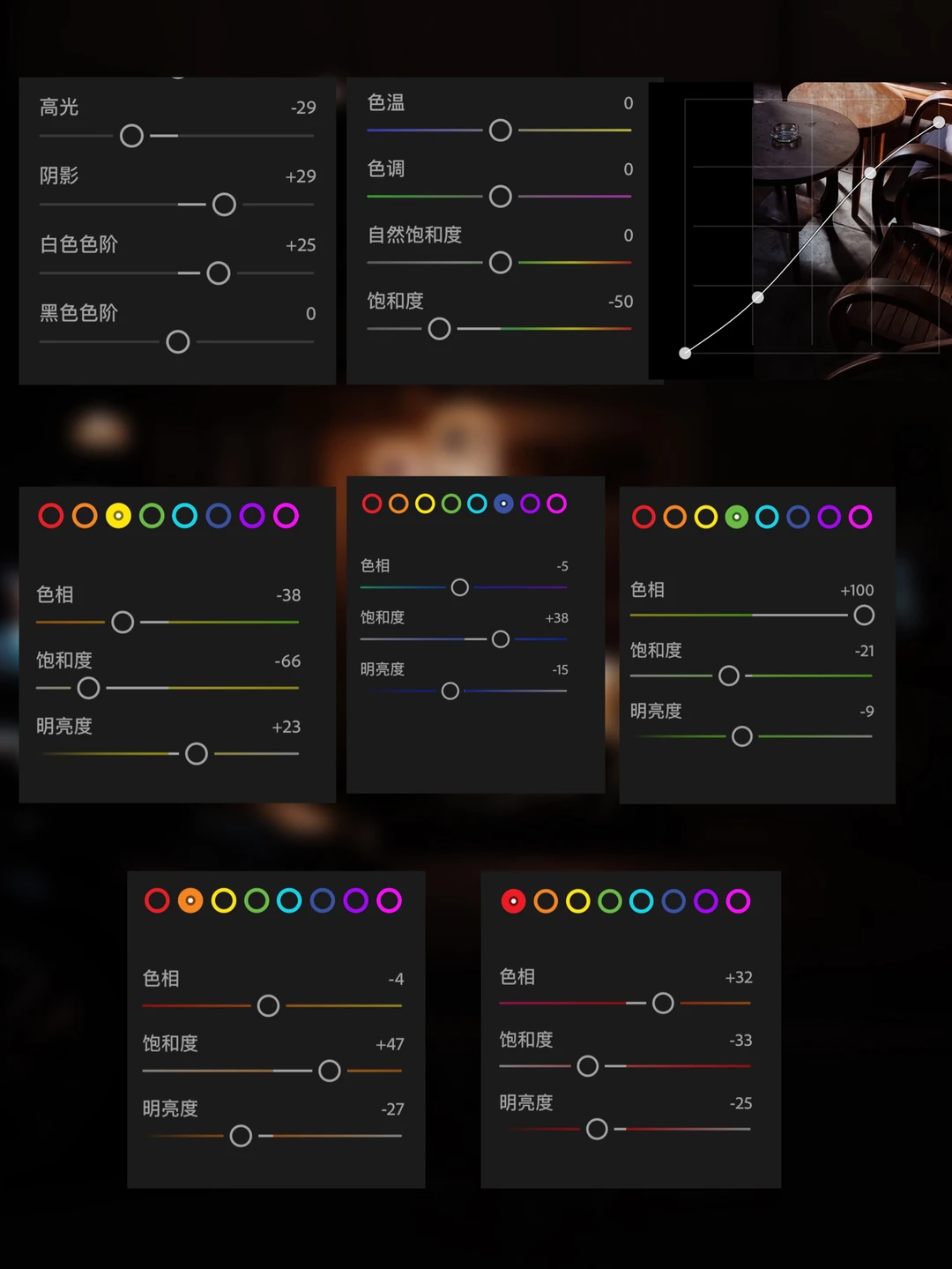 ☑ 思路是大比例降低照片饱和度,通过压低暗角使得照片充满类似电影画面低饱和暗调的氛围。调整HSL数值,把照片整体色调控制在巧克力🍫色调效果。